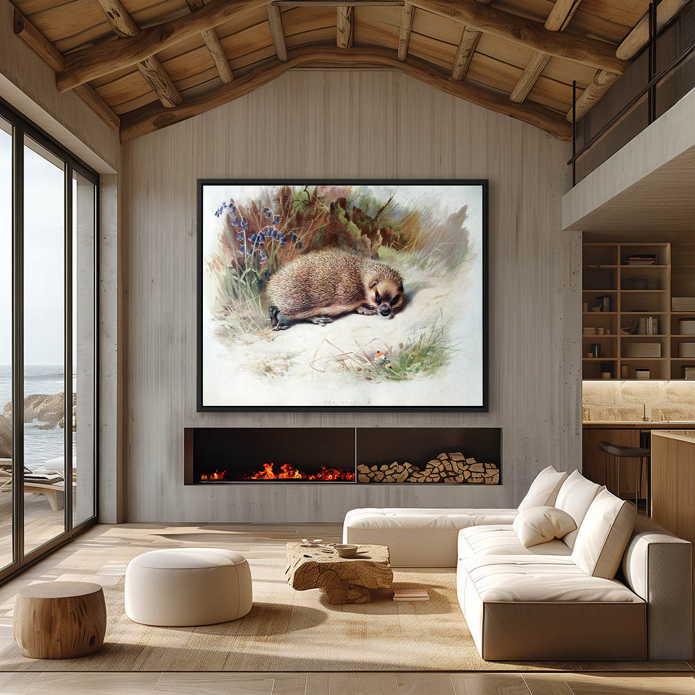 Painting of a Hedgehog Resting in the Grass watching a Butterfly
