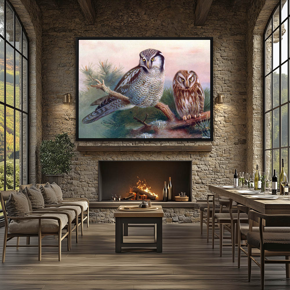 Painting of a Hawk Owl and a Tengmalm Owl Perched on a Limb