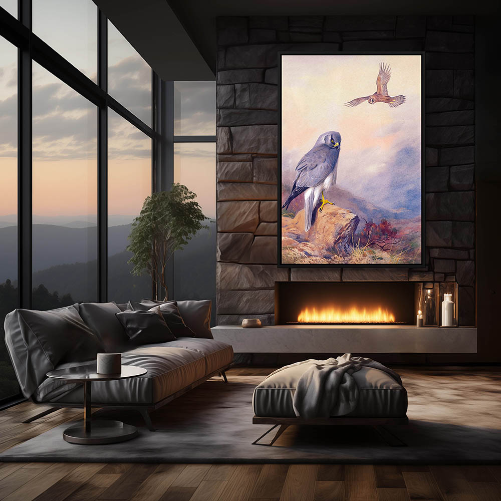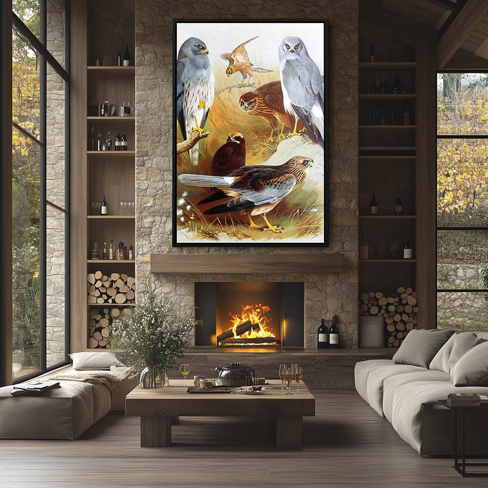 Bird Painting with Hawks Resting on the Rocks Overlooking the Landscape