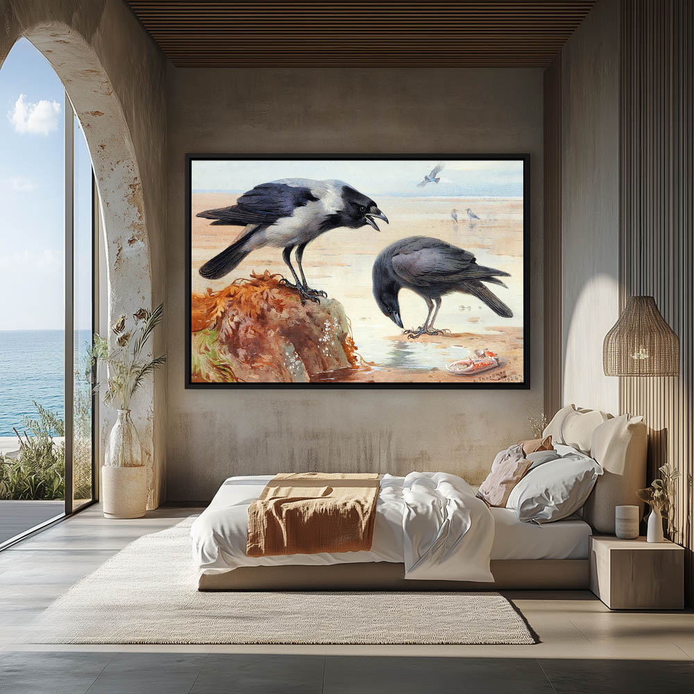 Painting of Crows on the Beach at Low Tide