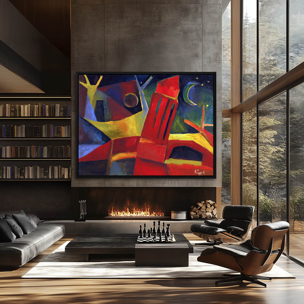Abstract cubist painting of Red Sun and Houses