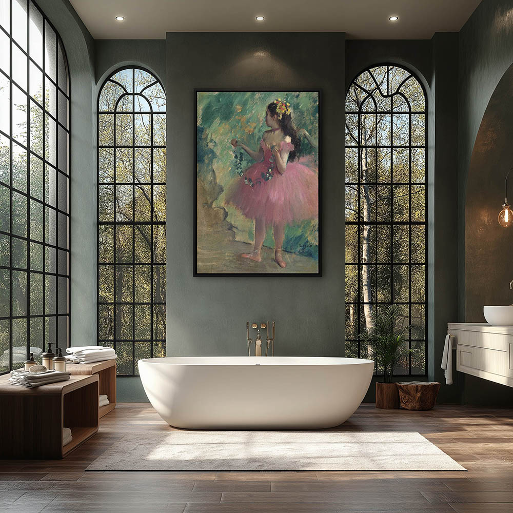 Ballerina in pink dress and tutu holding a sash of greenery and flowers