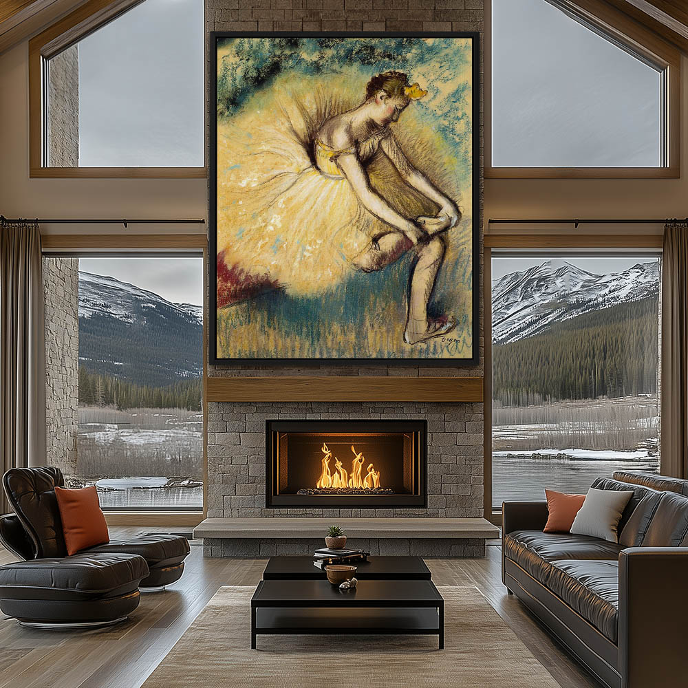 Dancer in full costume in yellow, sits putting on her shoes with her tutu balooned out all around her