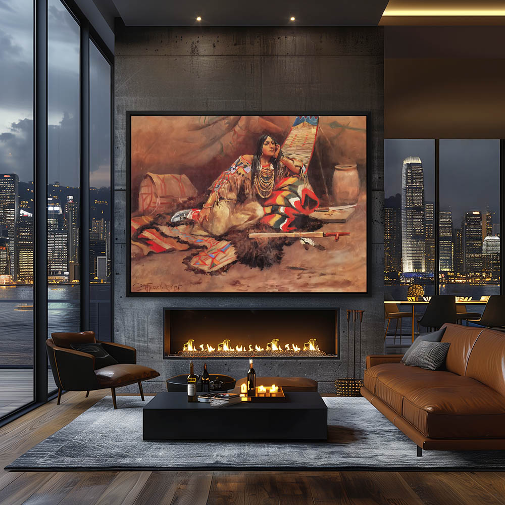 Indian woman in her teepee with a pipe, blanket and pottery