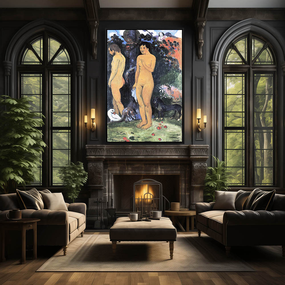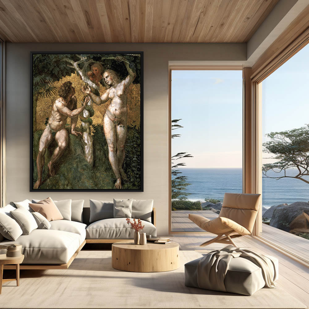Vintage Abstract Figurative Painting Depiction of Adam and Eve Nude in the Garden