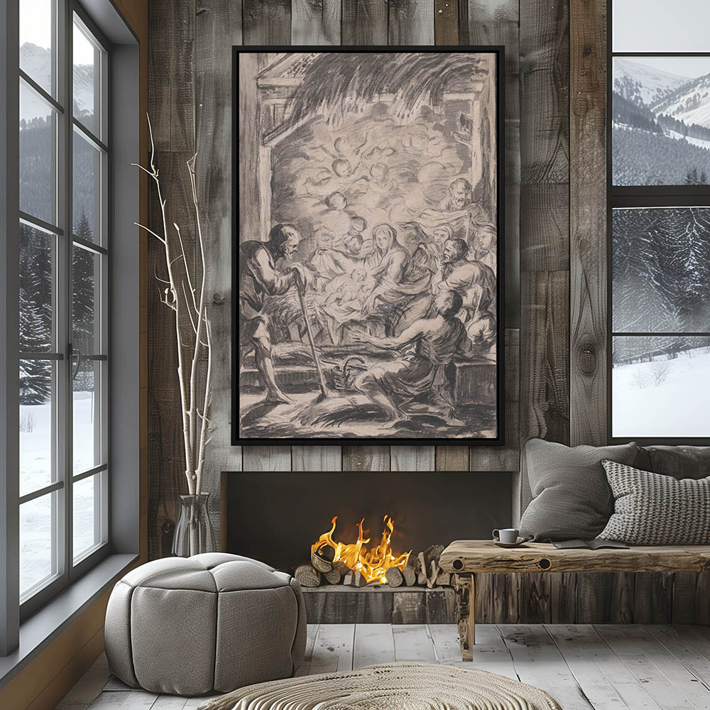 Vintage Figurative Religious Drawing of the Shepards Adoring the Virgin and Child
