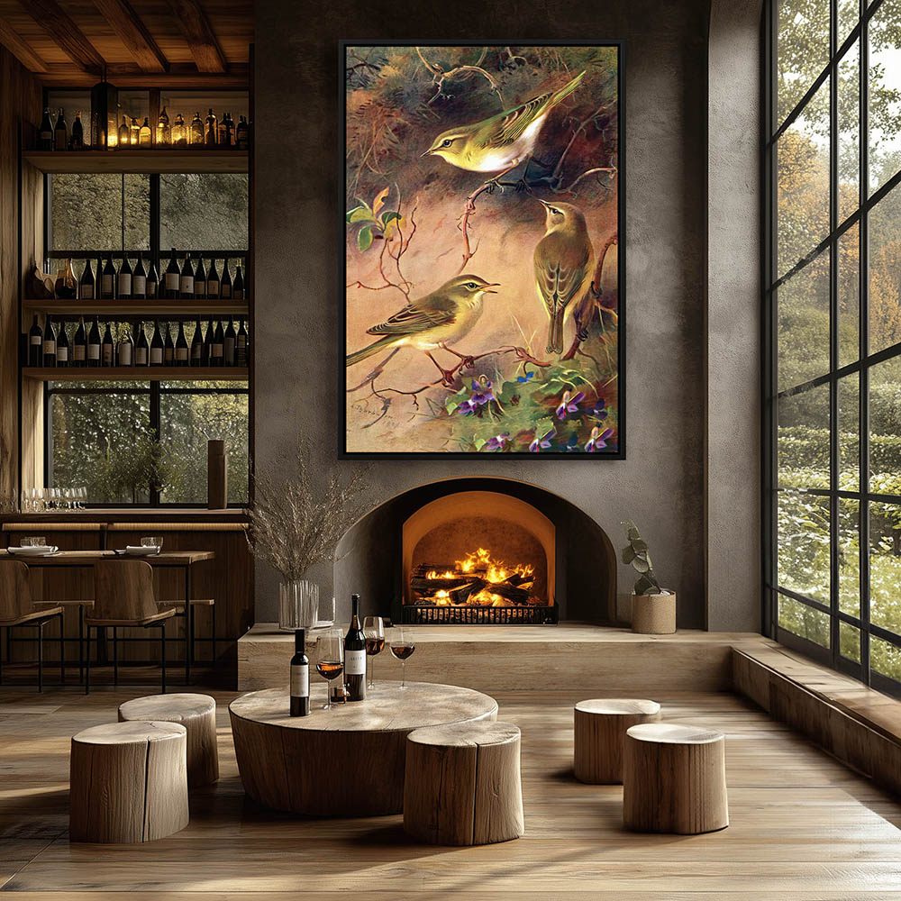 Painting of Wood Wren and Willow Wren Brids Resting on a Vine