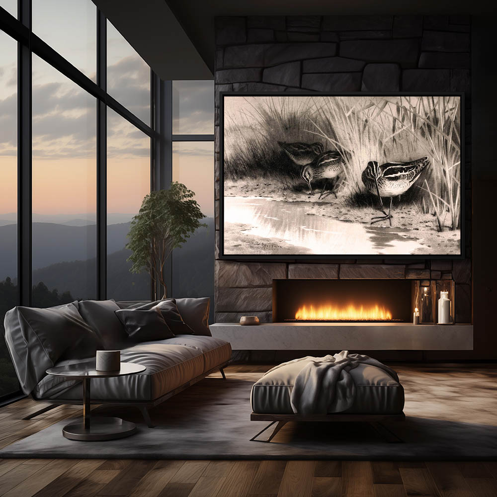 Painting of Woodcocks in the Grass and a Pool of Water in Black and White