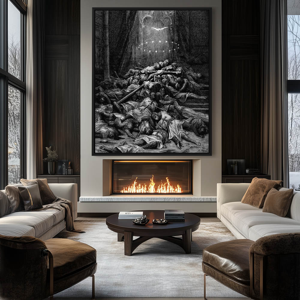 Painting of a Cock Pheasant on a Stump with Three Hens Forging in Black and White