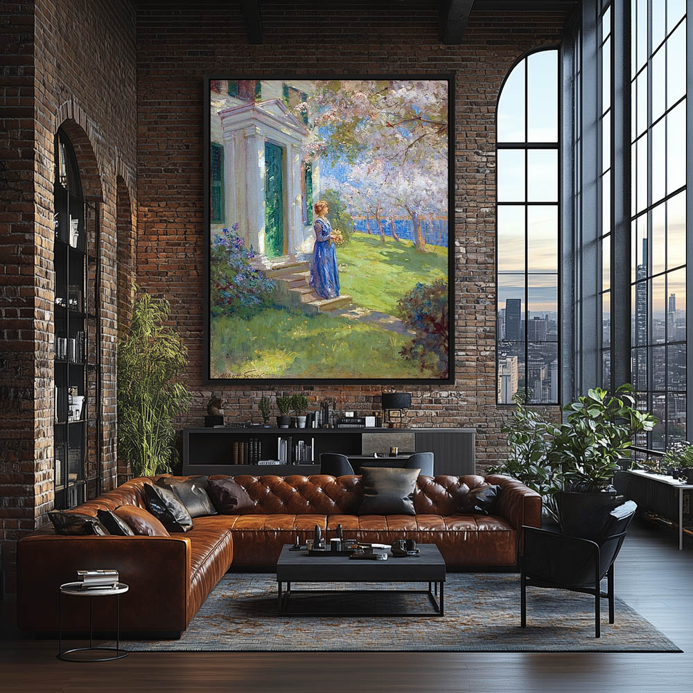 Vintage Landscape Painting walking out into the Yard with Spring Blossoms