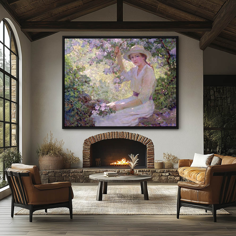Vintage Figurative Painting with a Woman Sitting under the Apple Blossoms