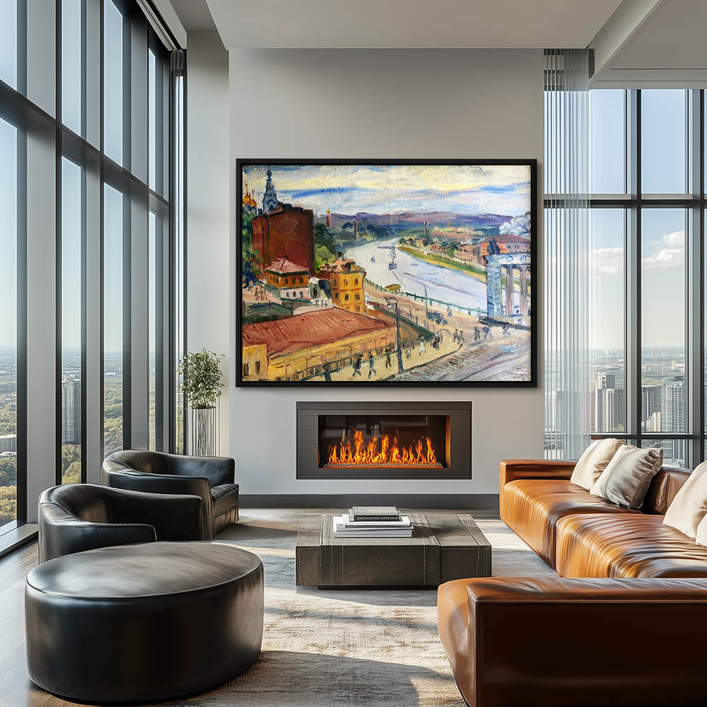 Vintage River Landscape Painting with a Bridge and Sailboats on the Water