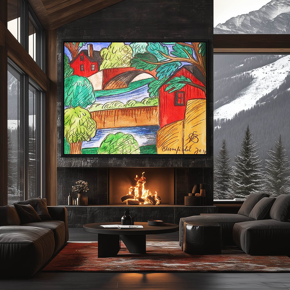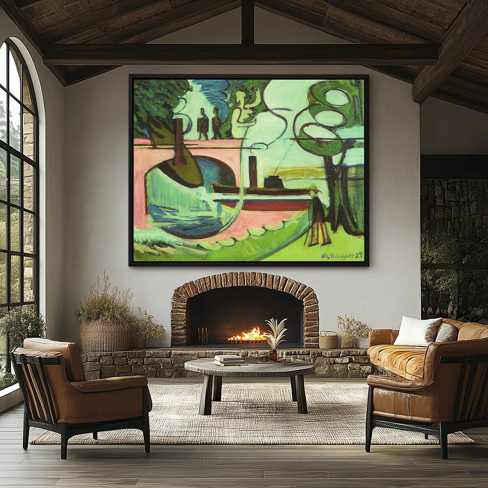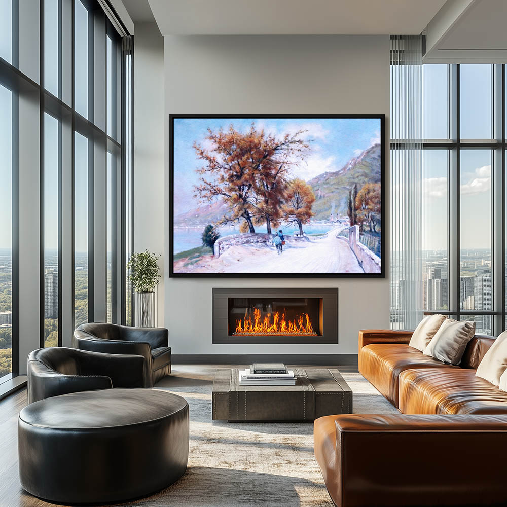 Coastal Lansdscape Painting with Two Figures Walking over a Bridge