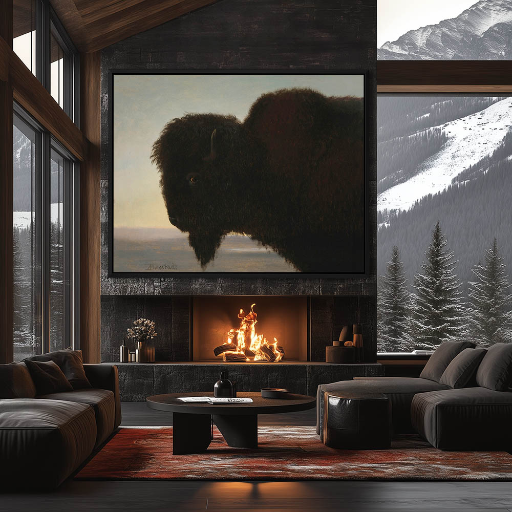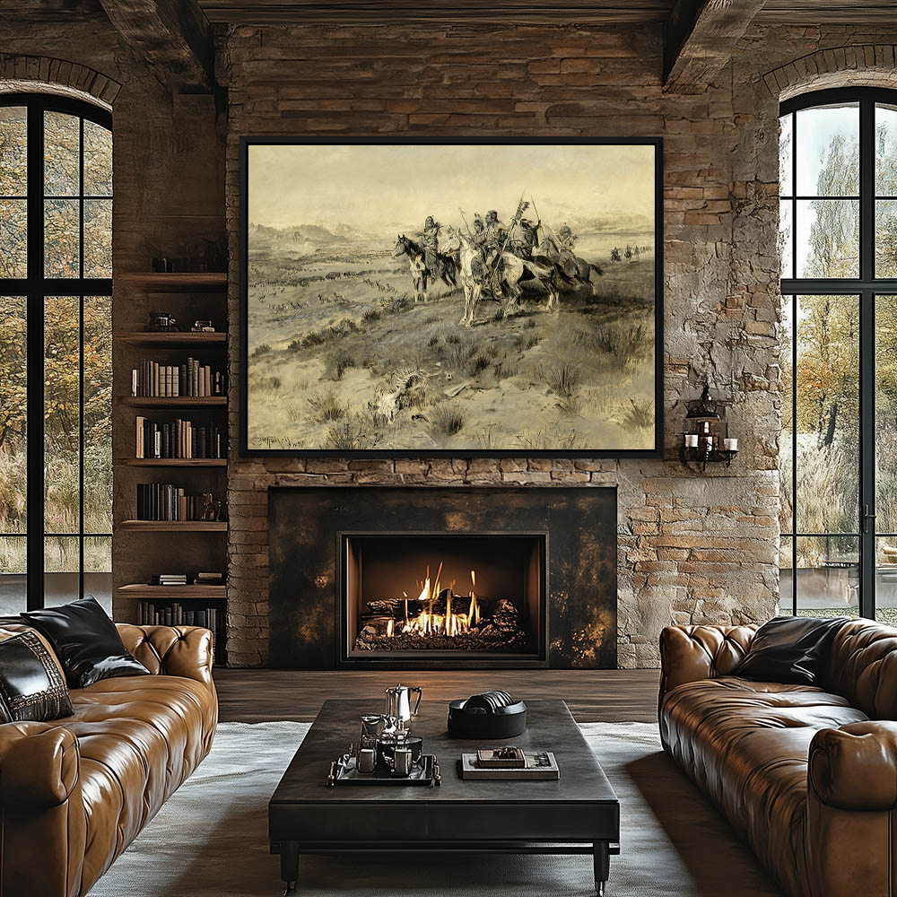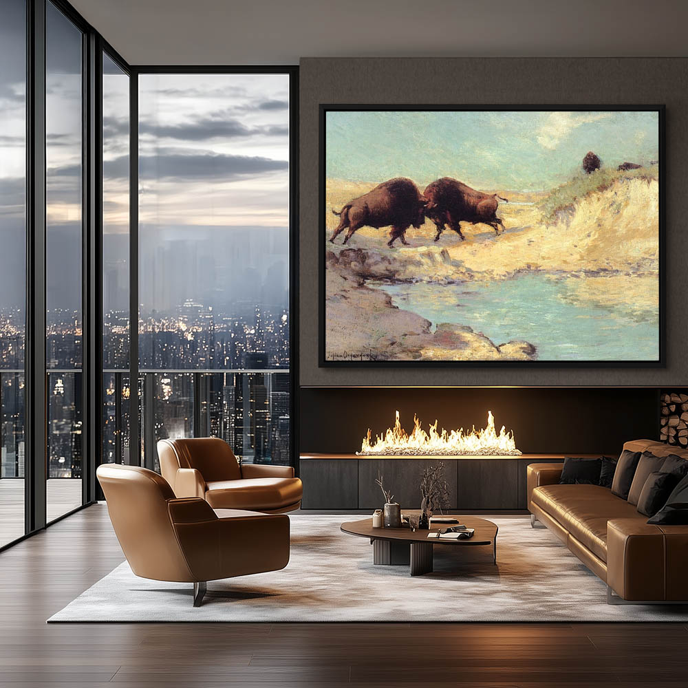Indian hunter on horseback running down a buffalo to shoot it with an bow and arrow
