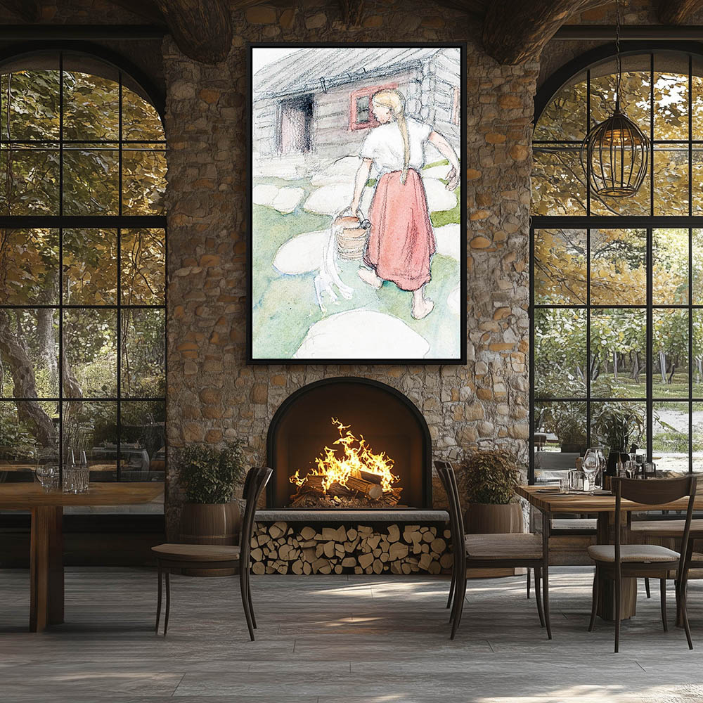 Landscape Painting with a Woman Carrying Water to the Cabin