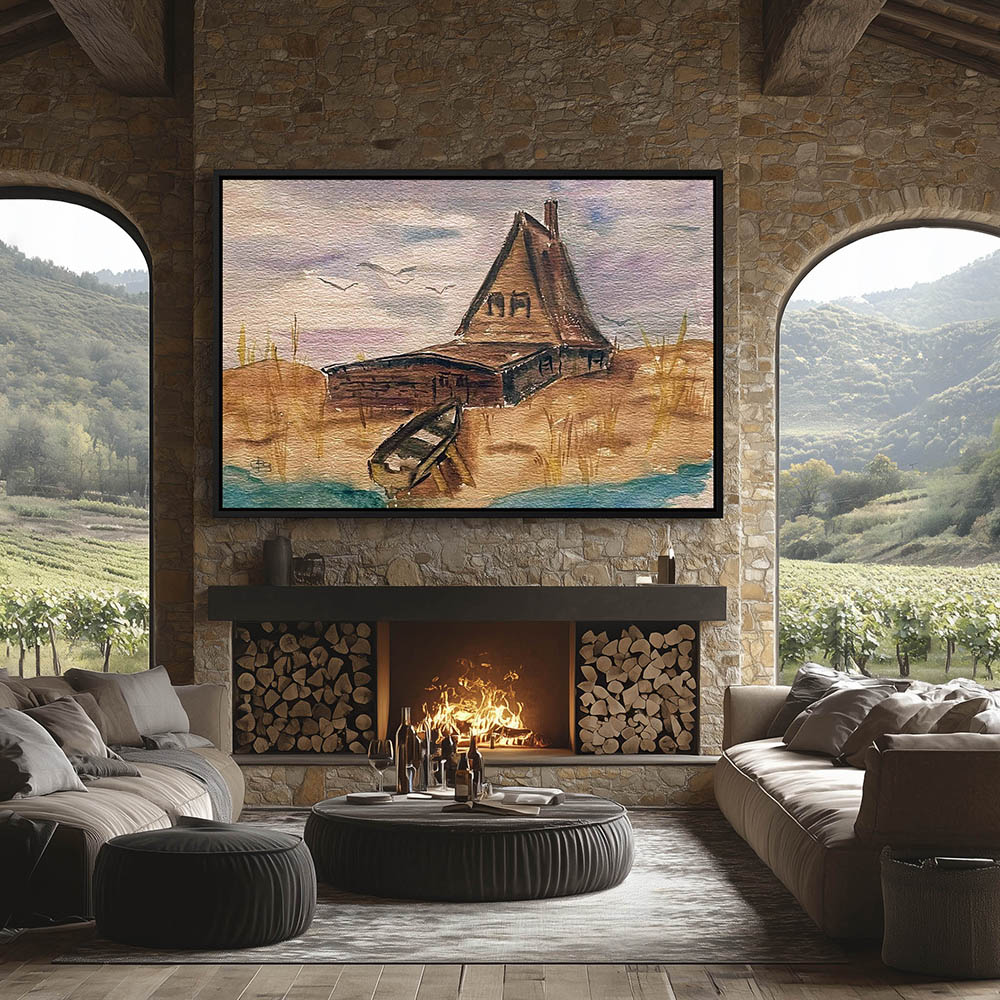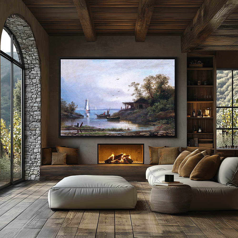 Landscape Painting with a Fish Camp on the Shore and Boat