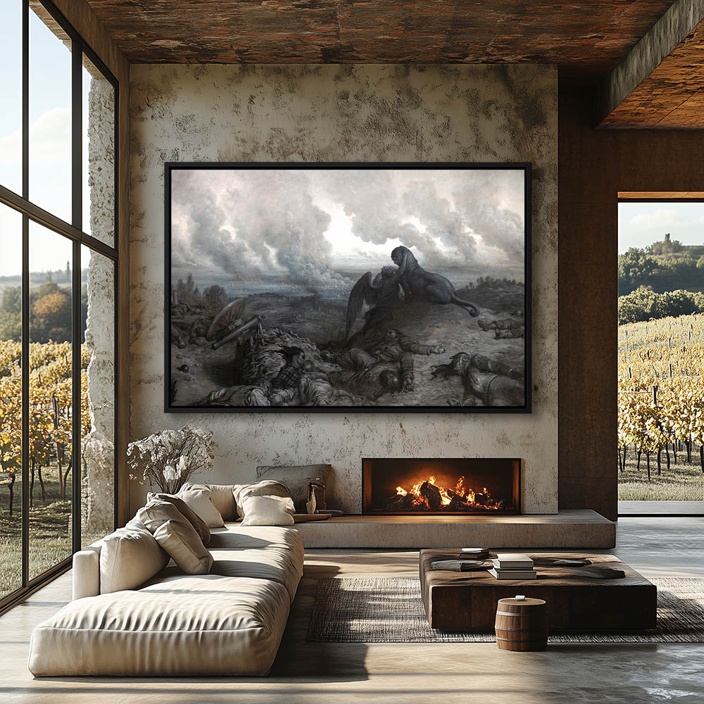 Aftermath of a tragic battle with burning cities in the distance