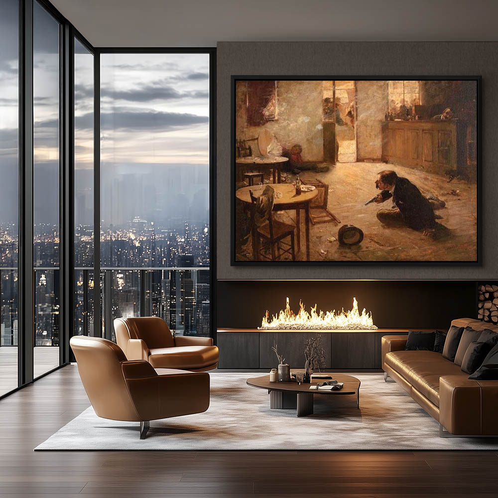 Two men on the floor of a saloon, chairs and tables overturned, pistol in the hand of one man, the other slumped against the wall. Smoke still lingers in the air from a gunfight