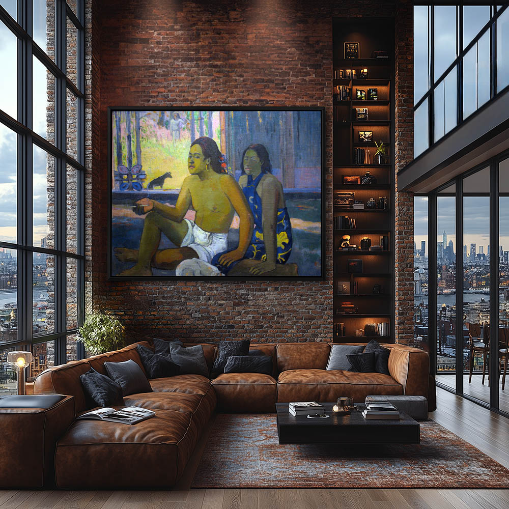 Two Figures with a cat resting in the hut with a dog in the background