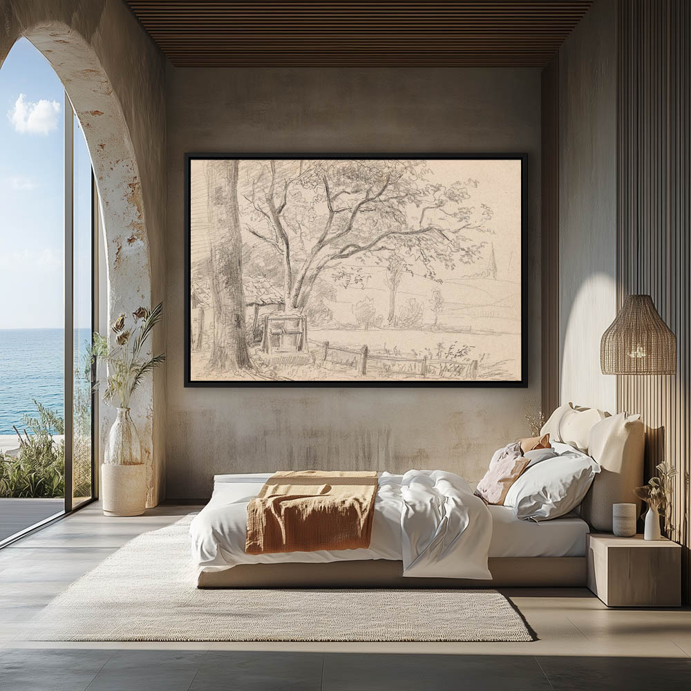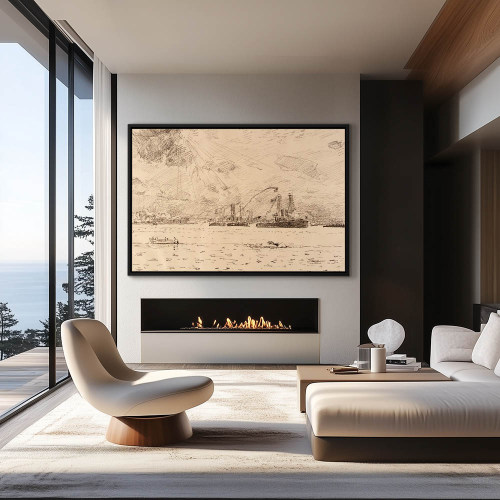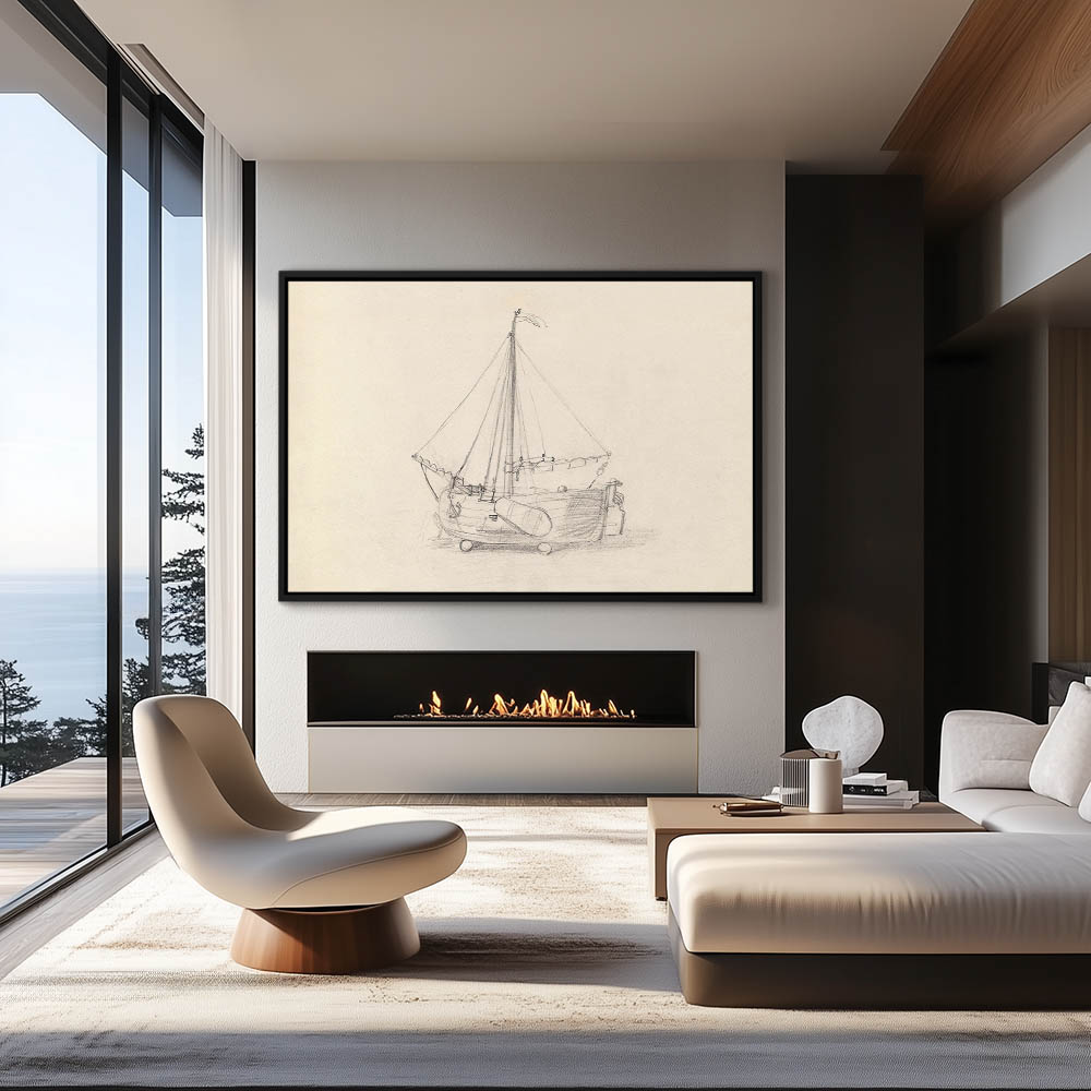 Sketch of a sailboat on land, anchor drawn in and sails furled