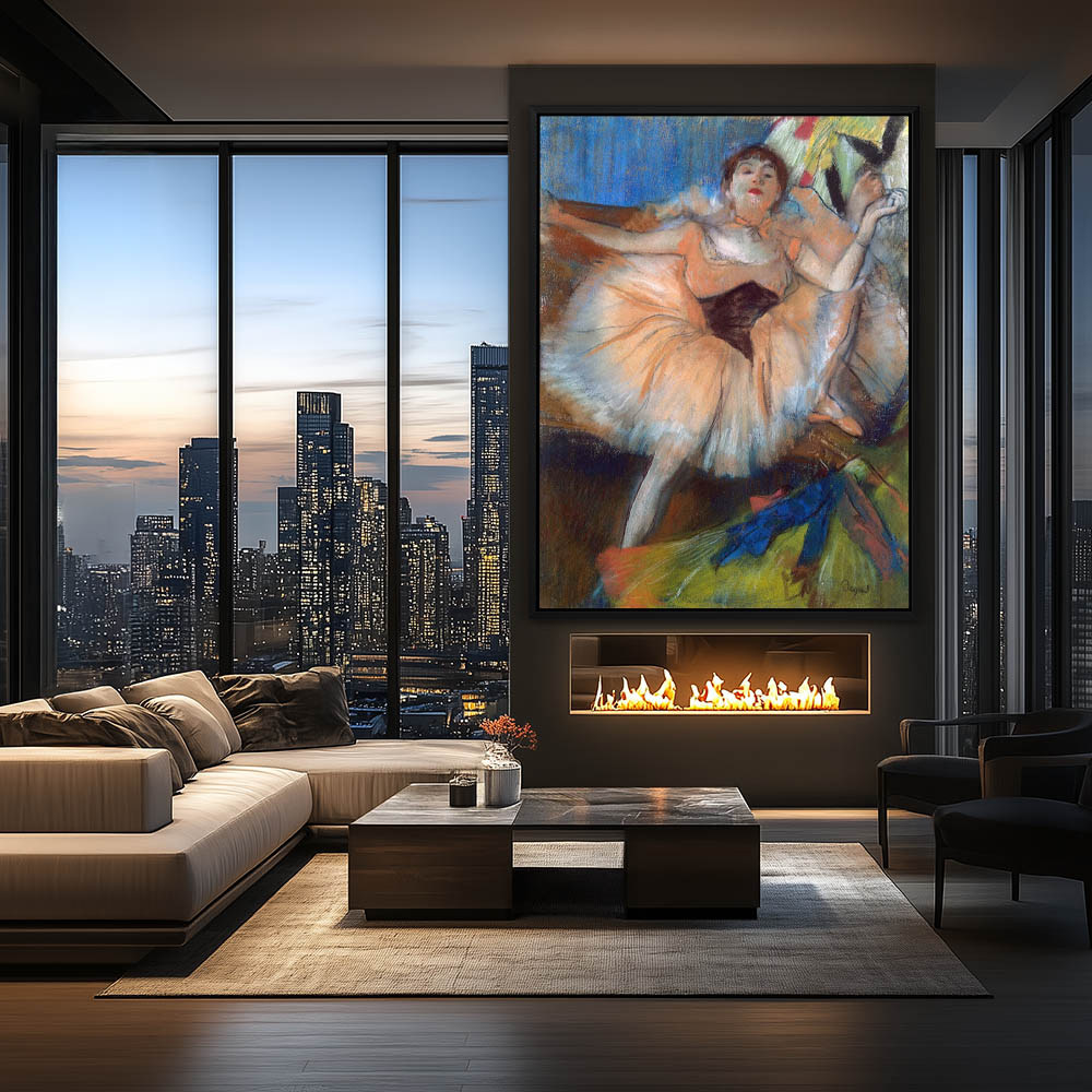 Ballet dancer in full costume and tutu, seated among other costumes