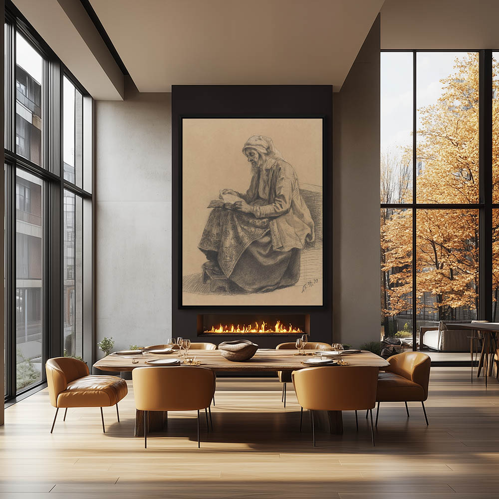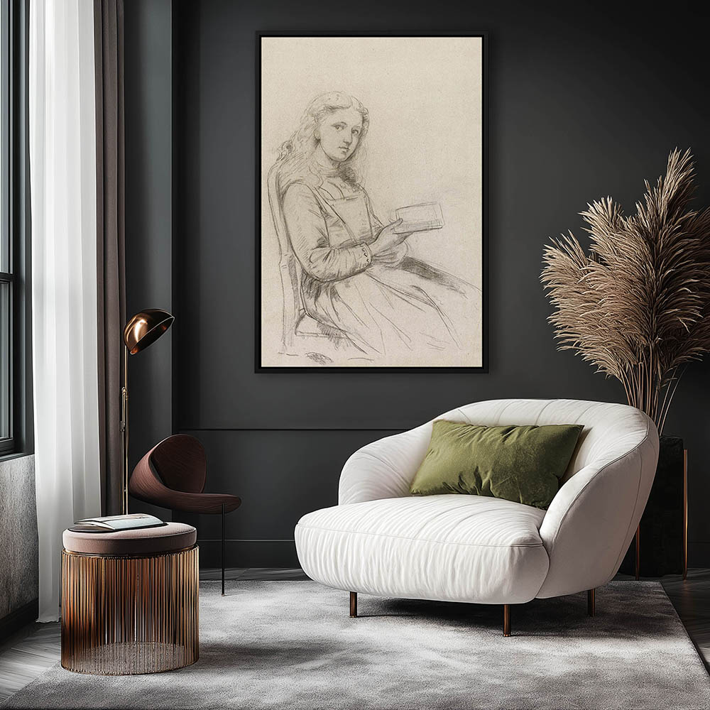 Portrait drawing of a young girl, seated with a book in her hand