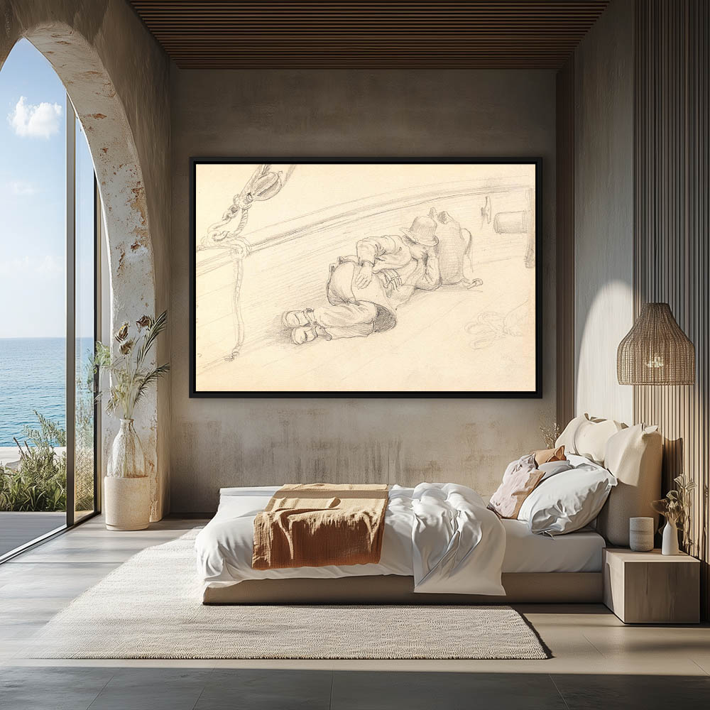 Drawing of a man on the deck of a boat sleeping with his head propped on a sack and his hat pulled low on his face