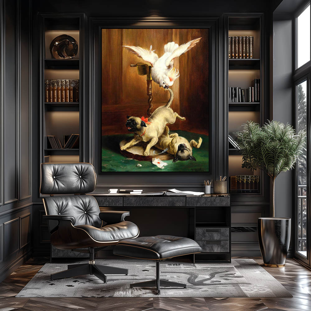 Two pugs with a cockatoo who has one dog by the tail