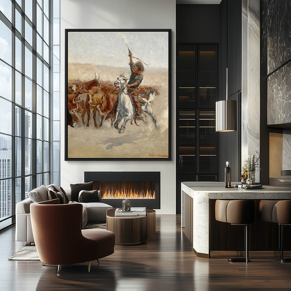 Cowboy on horseback firing a handgun into the air to move a herd of cattle