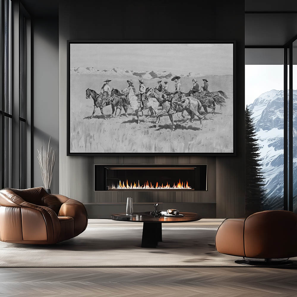 Cowboys on horseback on the plains with mountains in the distance