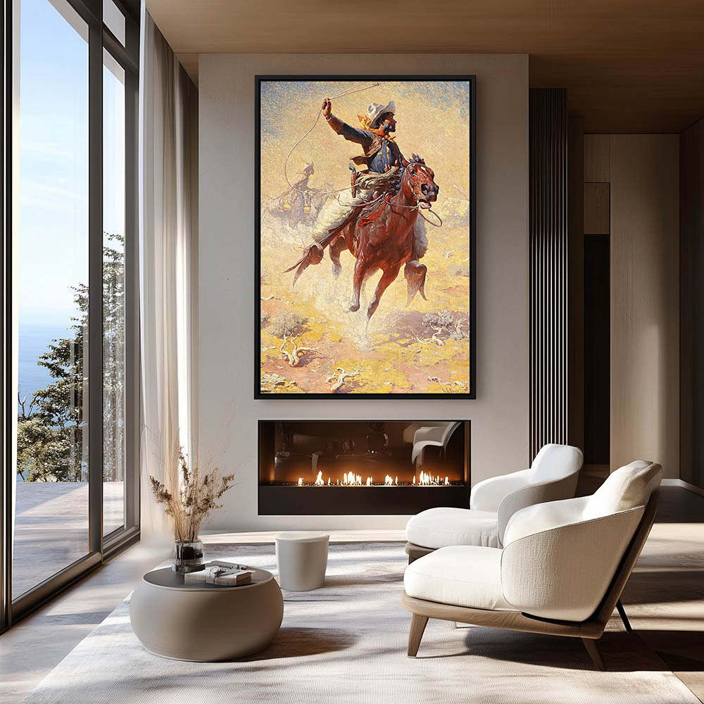 Cowboys on horseback chasing and roping a stray steer