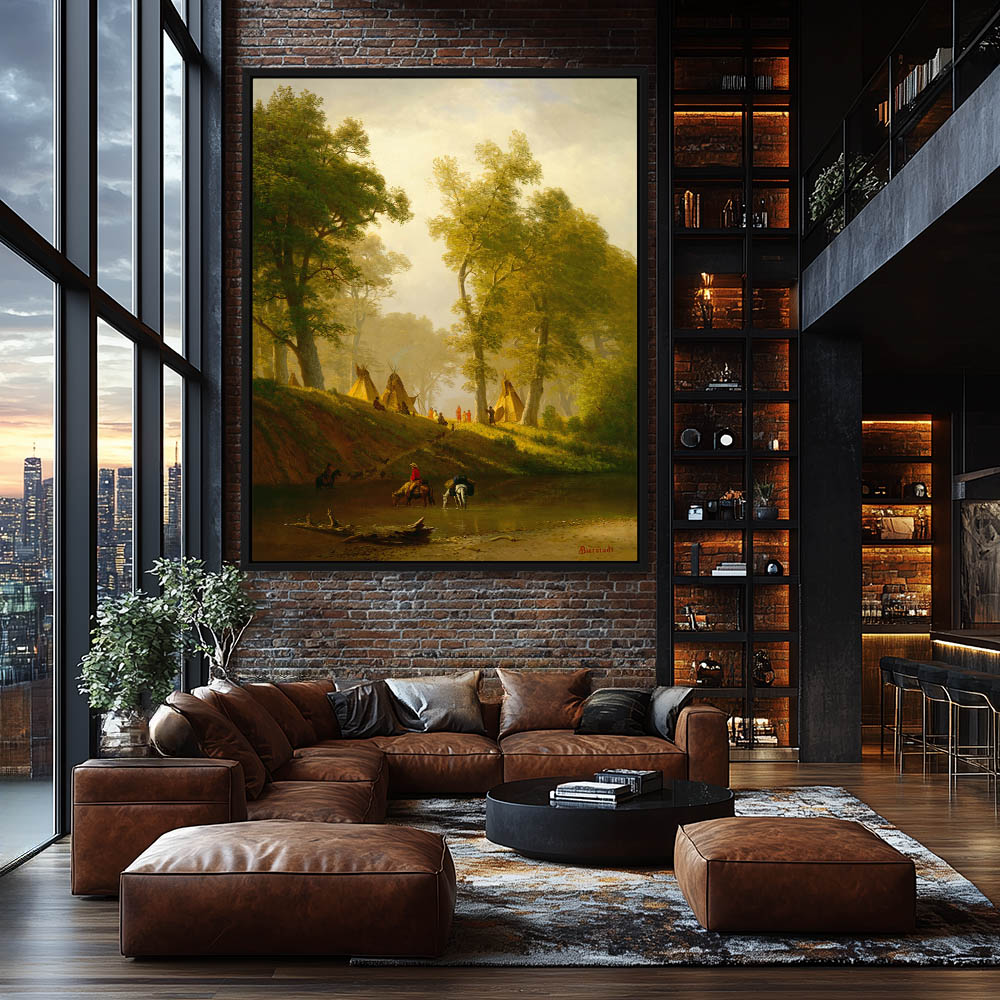 Cowboys on horseback crossing a river to an Indian camp on the far bank