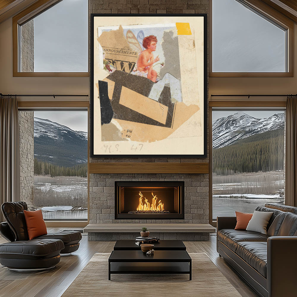 Abstract collage with newsprint and a print with a fairy child