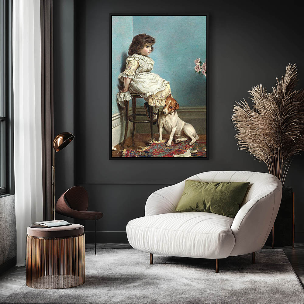 Young girl and a small dog, exiled to a stool in the corner after some mischief