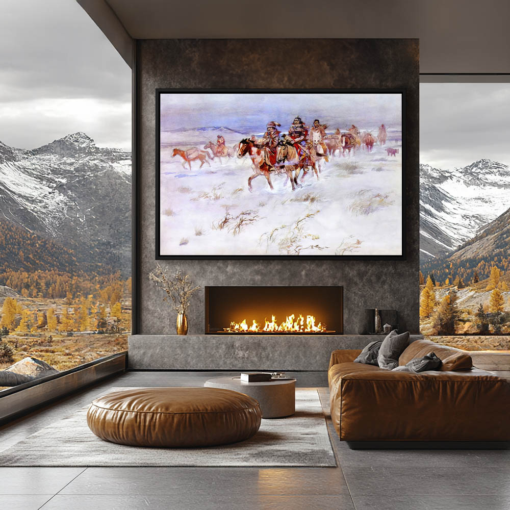 Cree Indians on horseback traveling across the plains in the snow