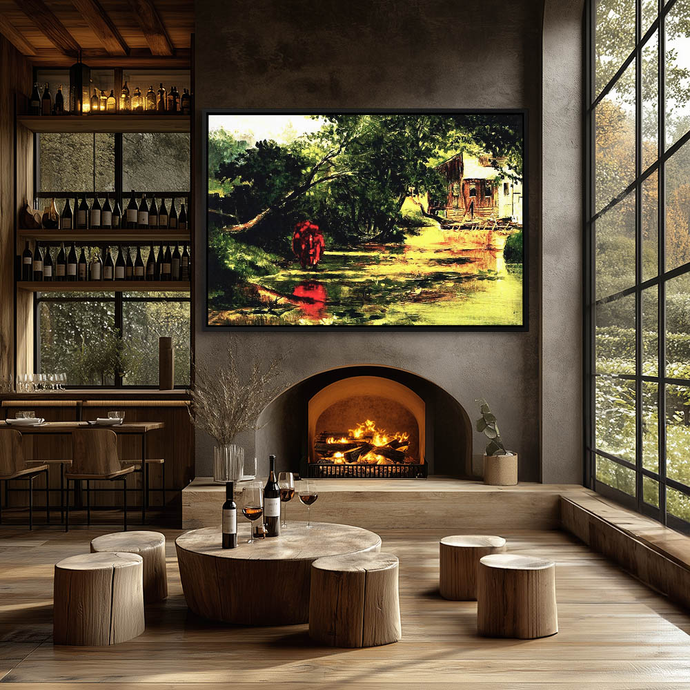 Landscape Painting with a Red Cow in the River with a Shack in the Background