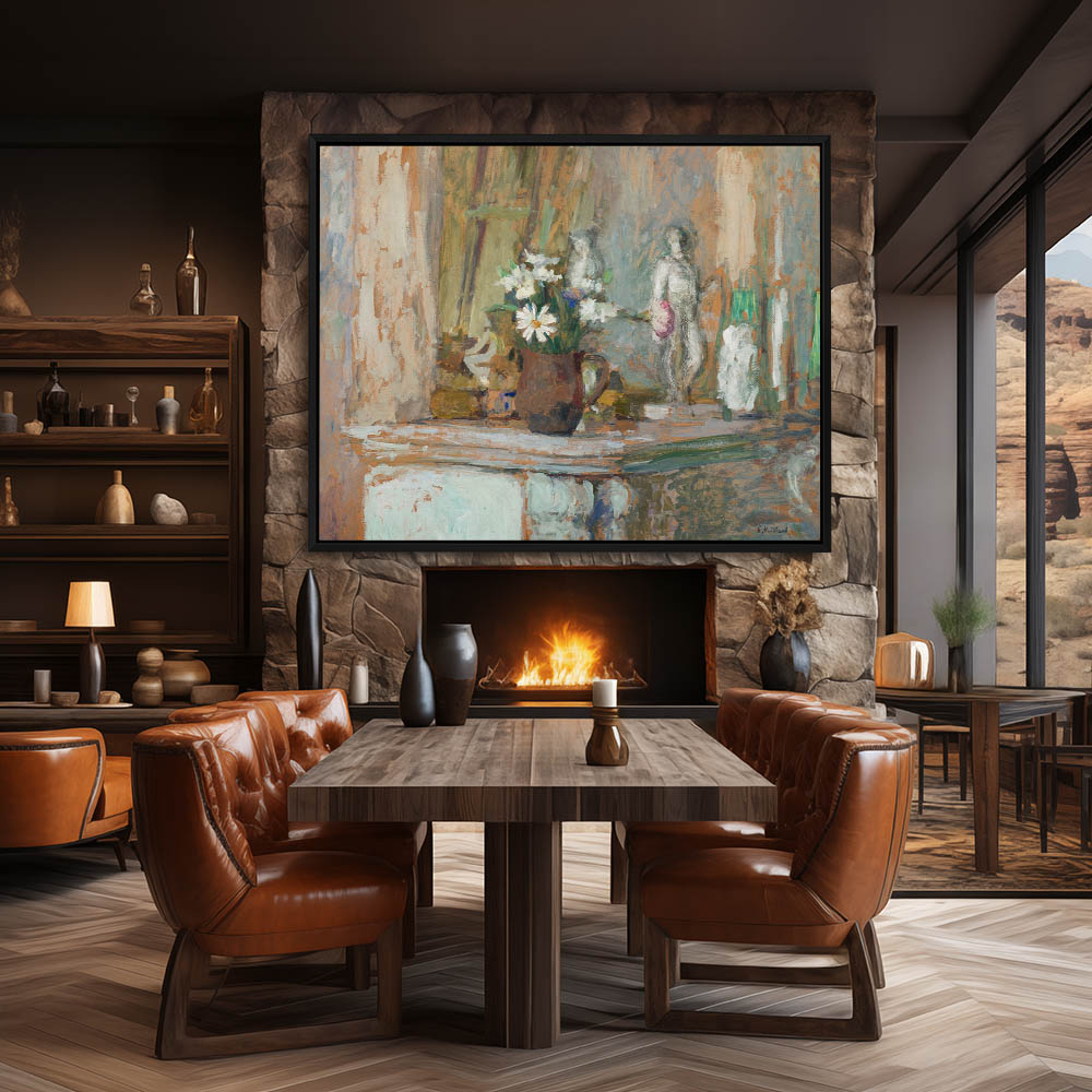 White flowers in a dark pitcher along side a small statue on a mantle
