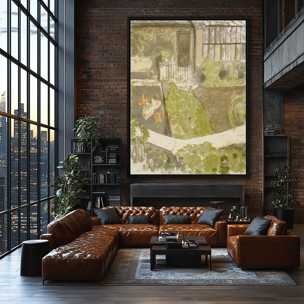 Figures in the courtyard garden with trees and greenery.