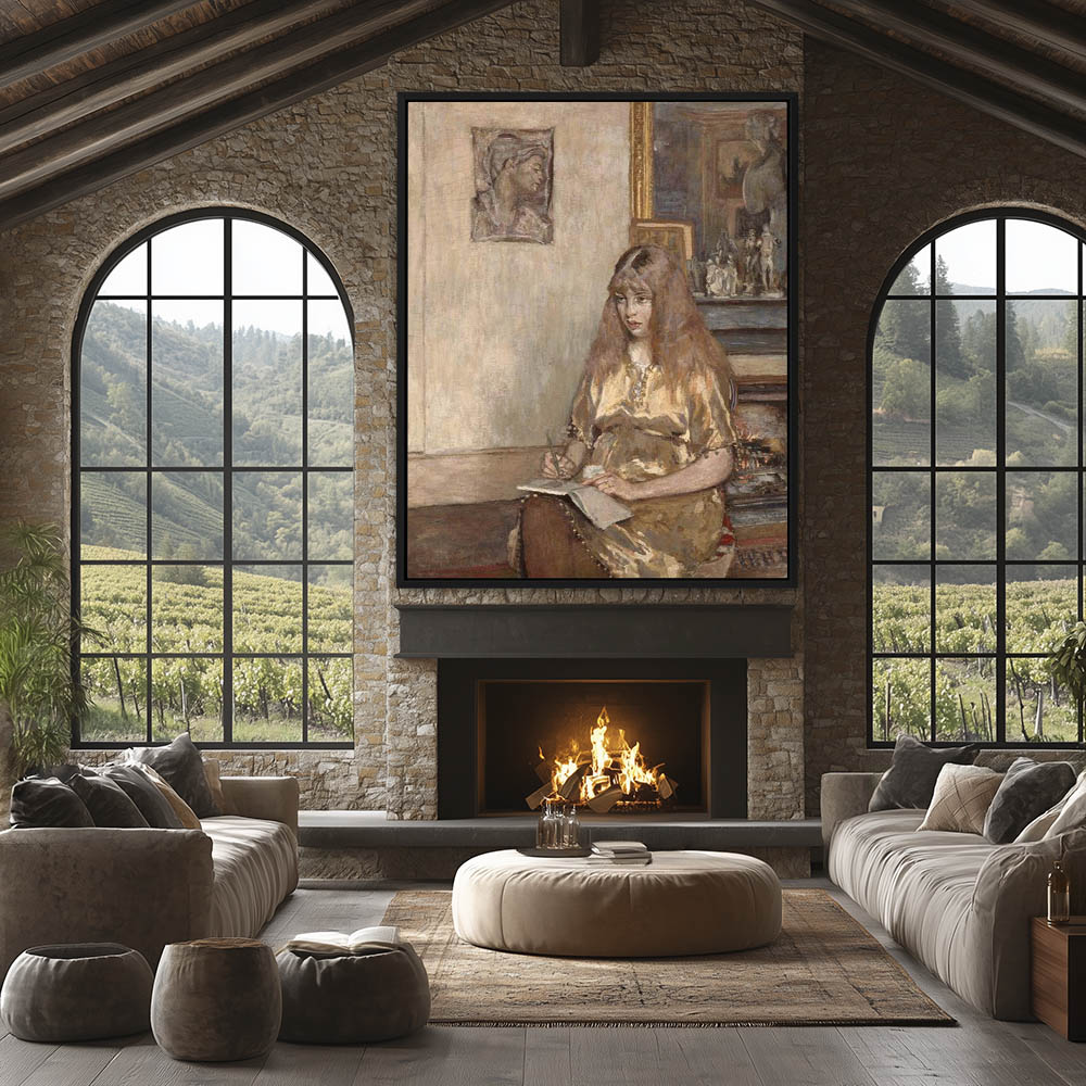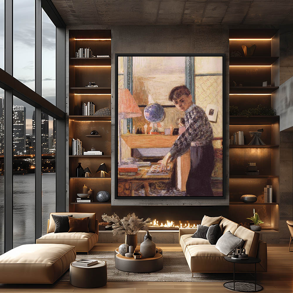 Boy standing at a table with books and a lamp, with figures and a globe on the mantel in the background
