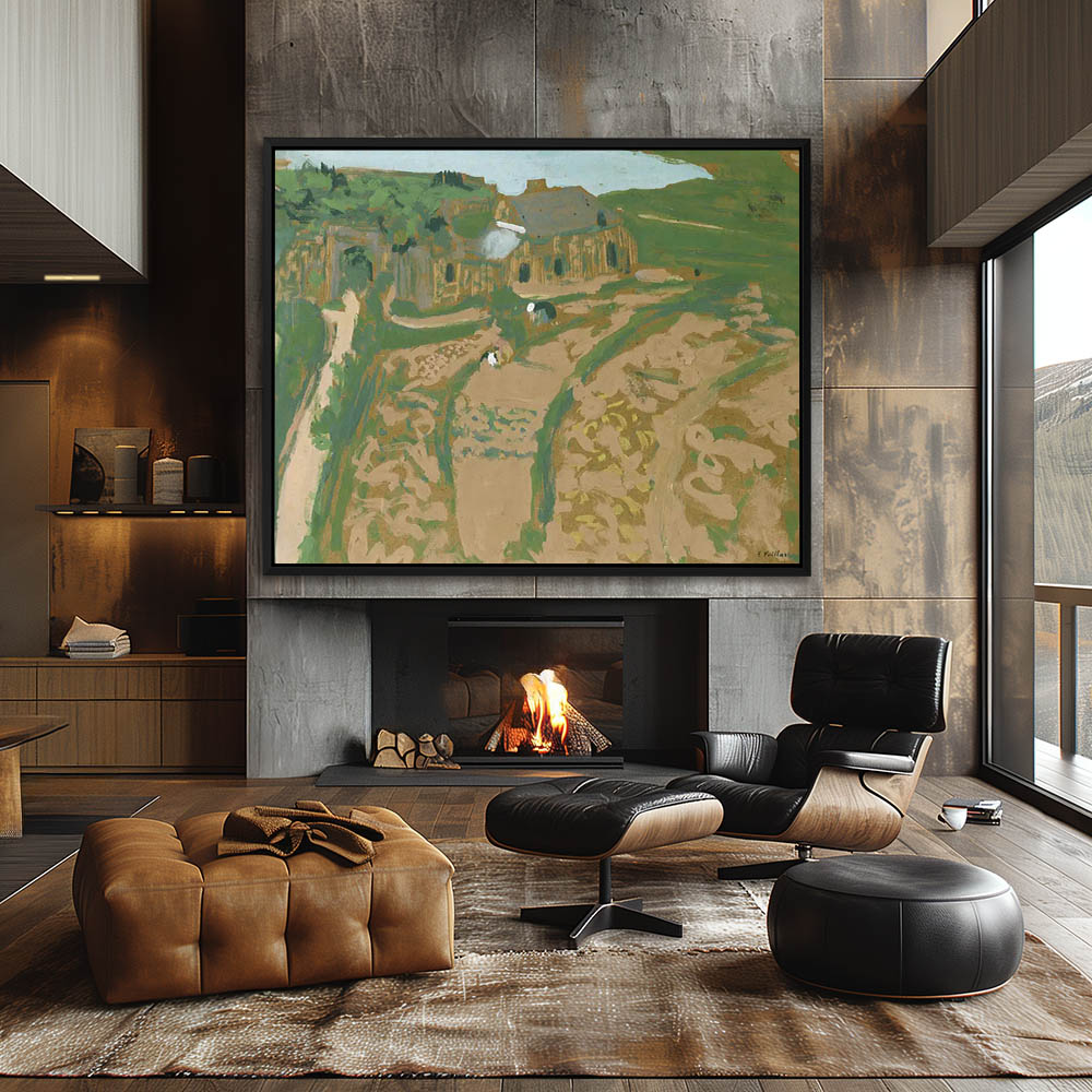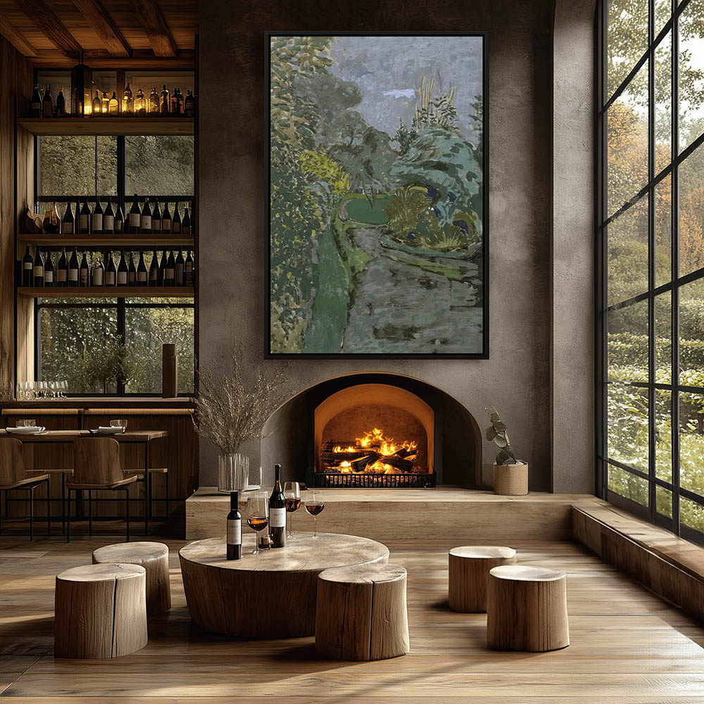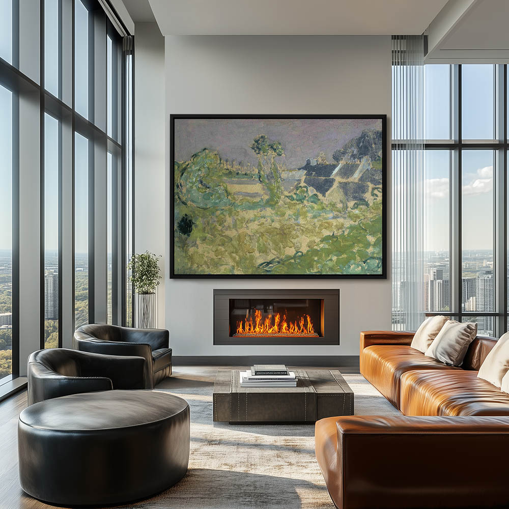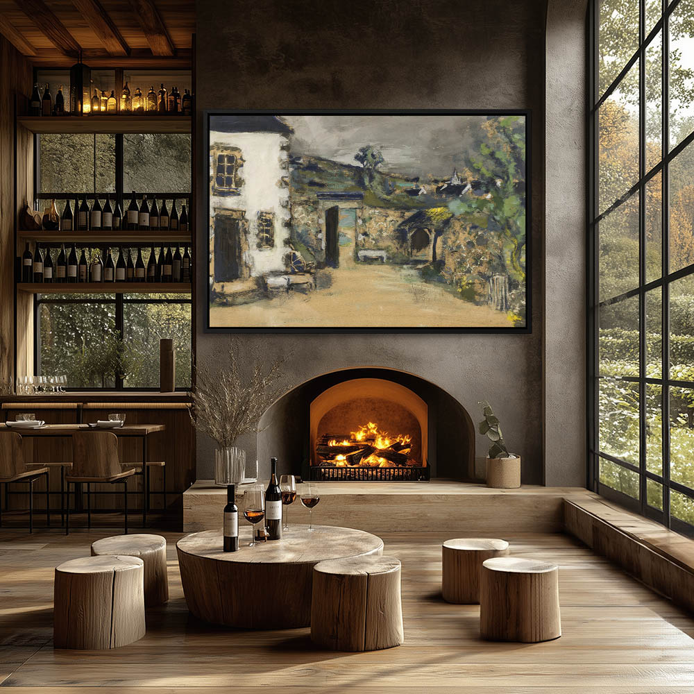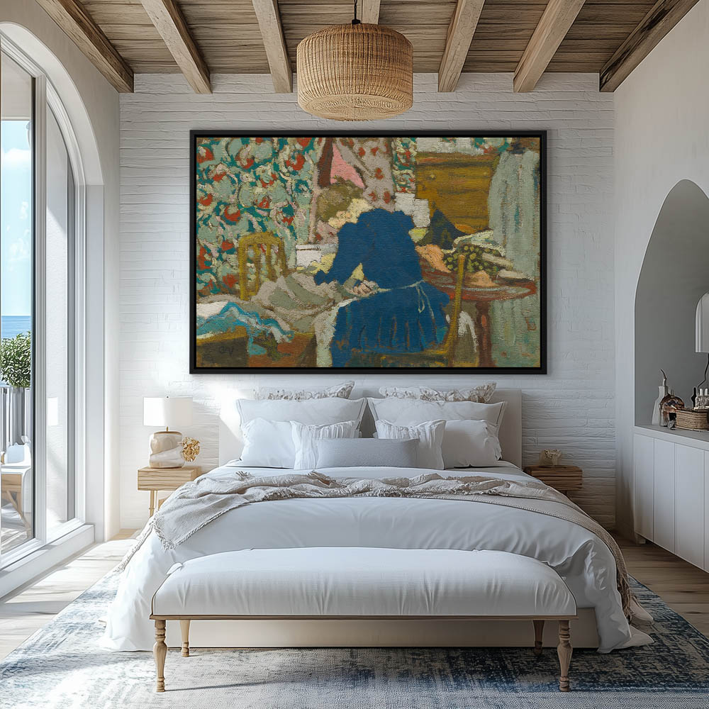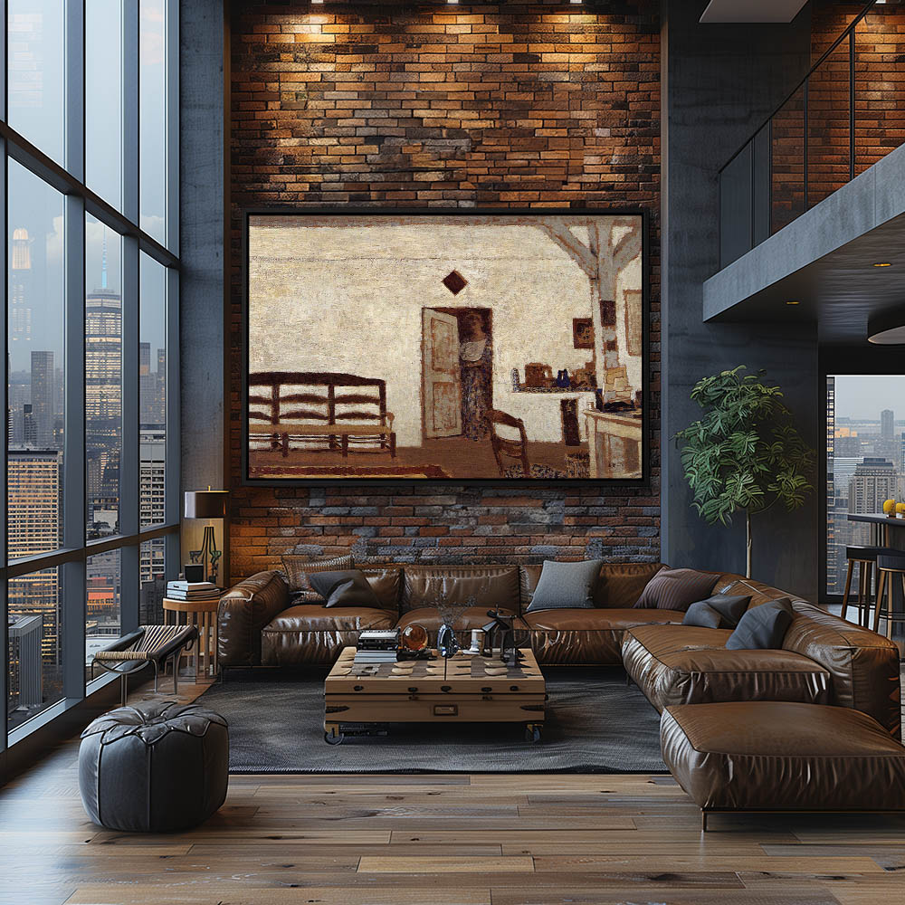 Simple interior with white washed walls, a woman in a floral dress standing in the open door