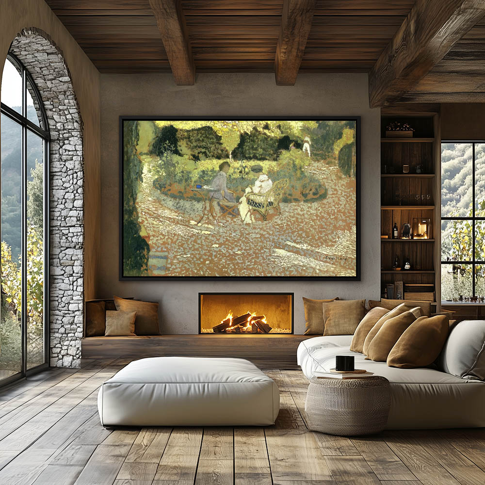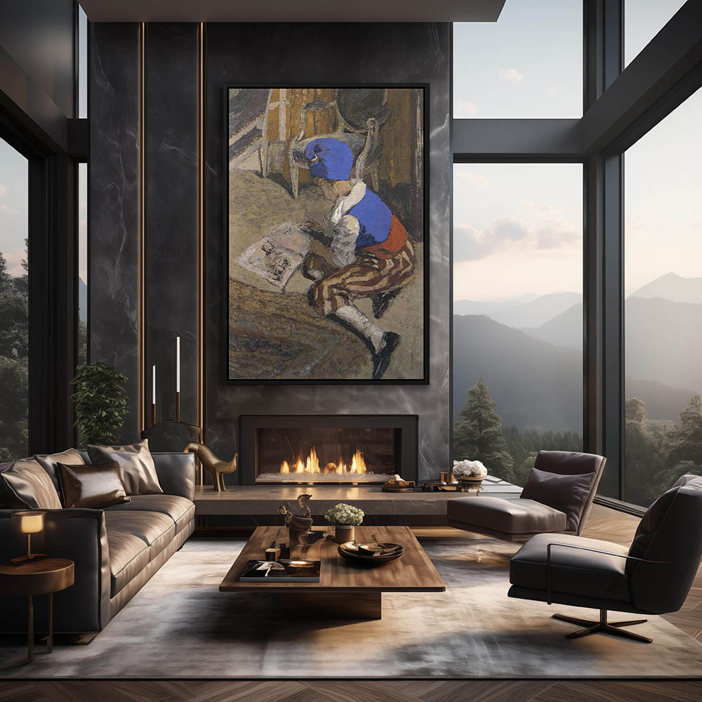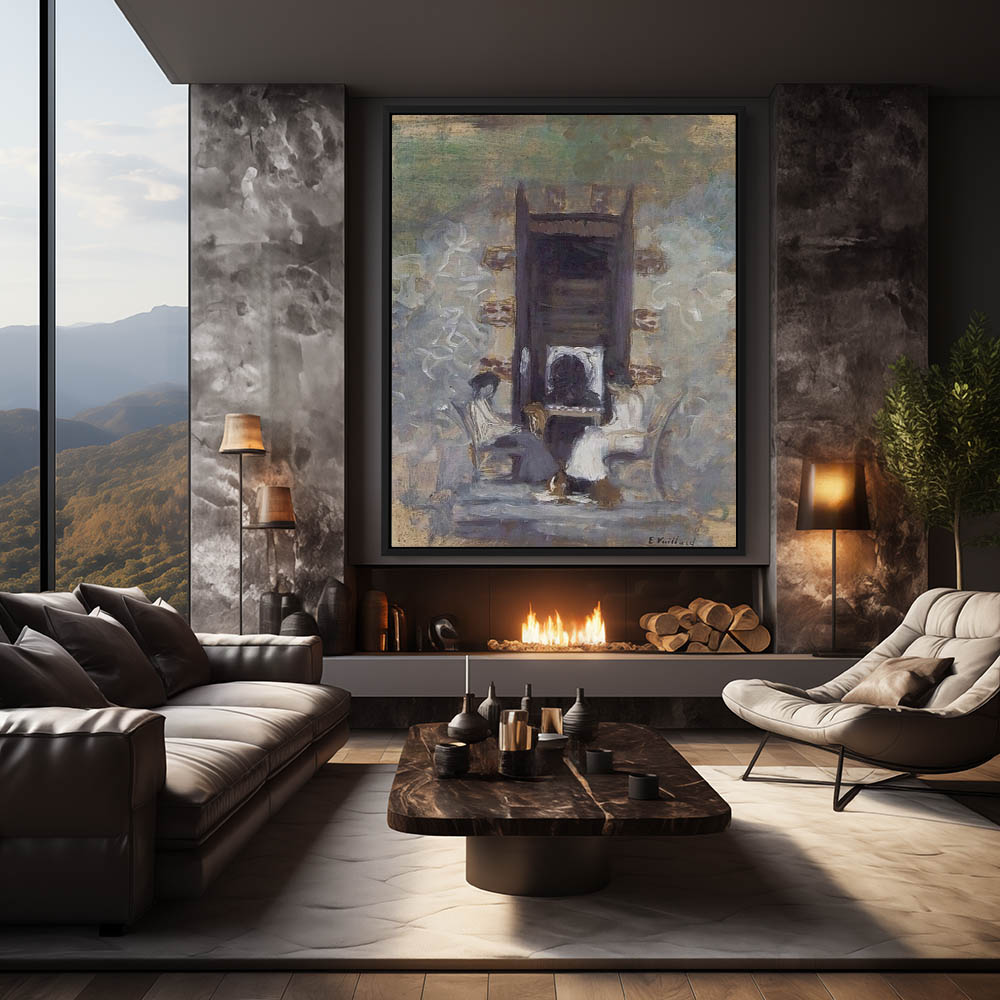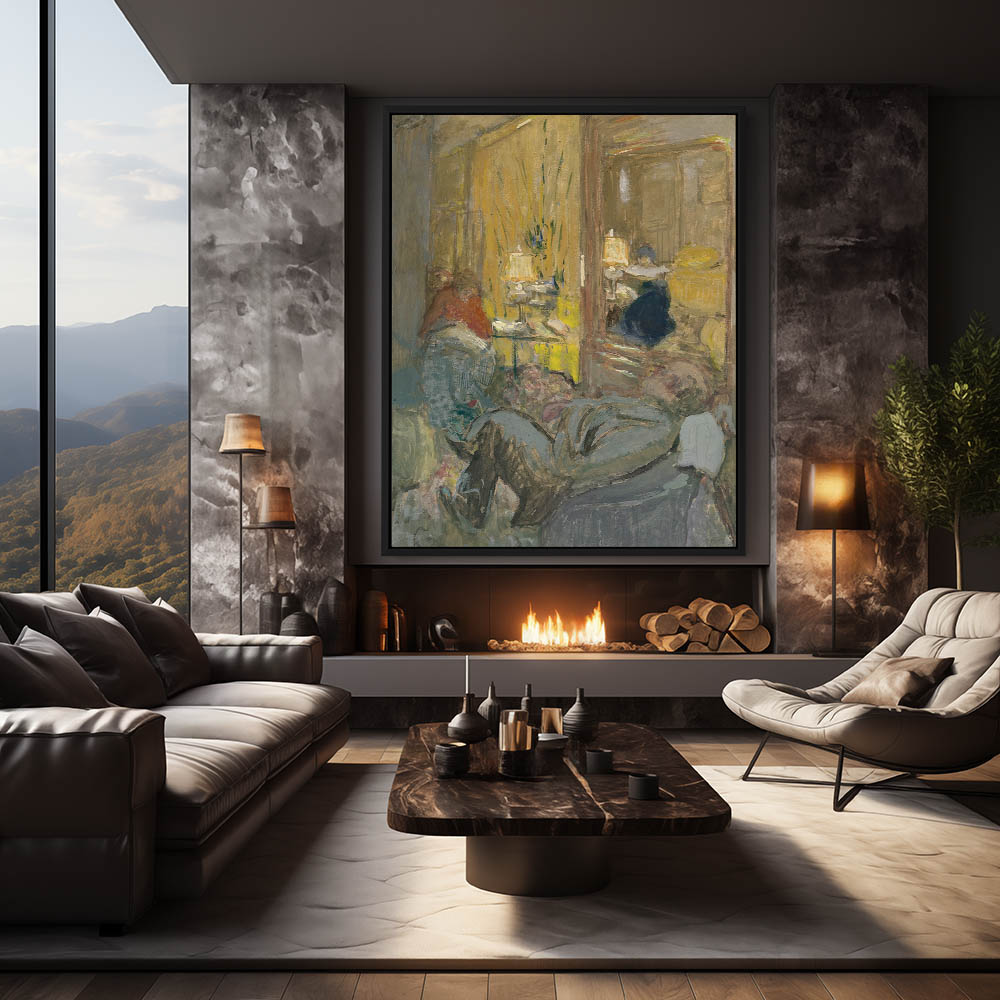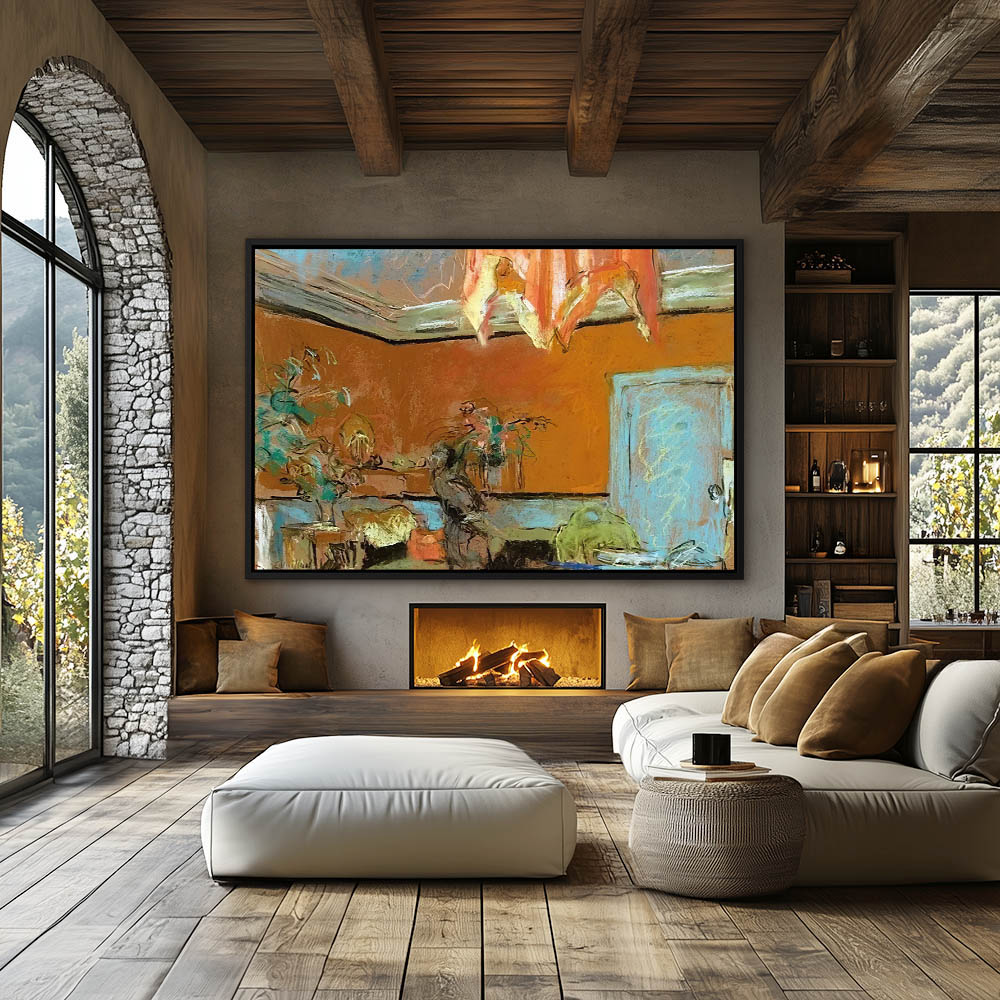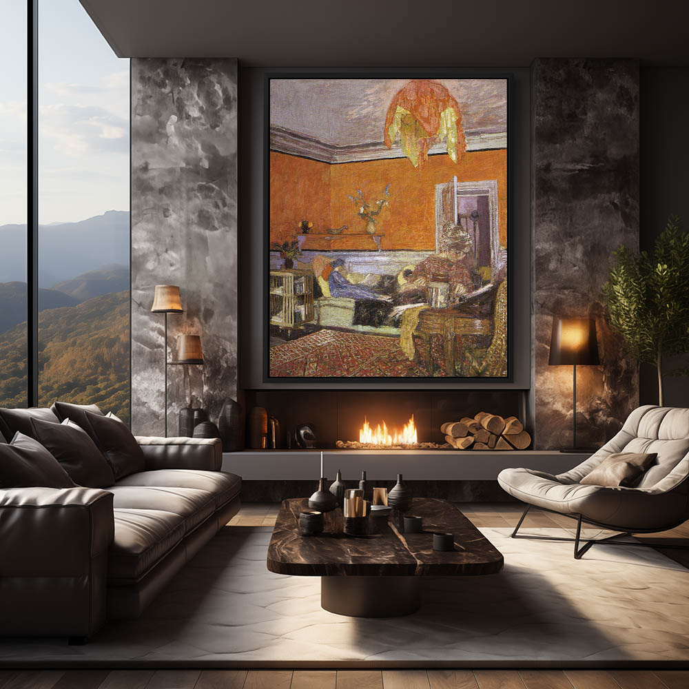 A woman at a desk and one laying on a sofa in a room dominated by orange walls and an ornate light fixture.