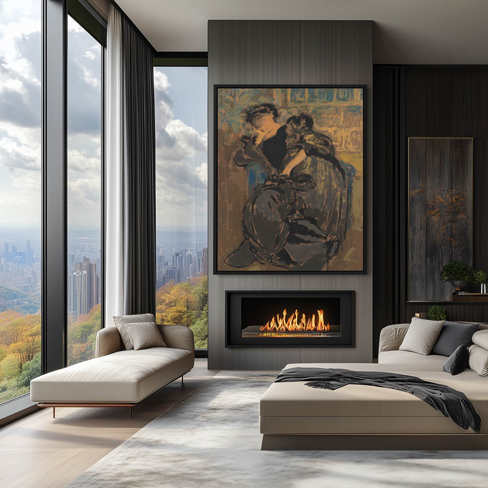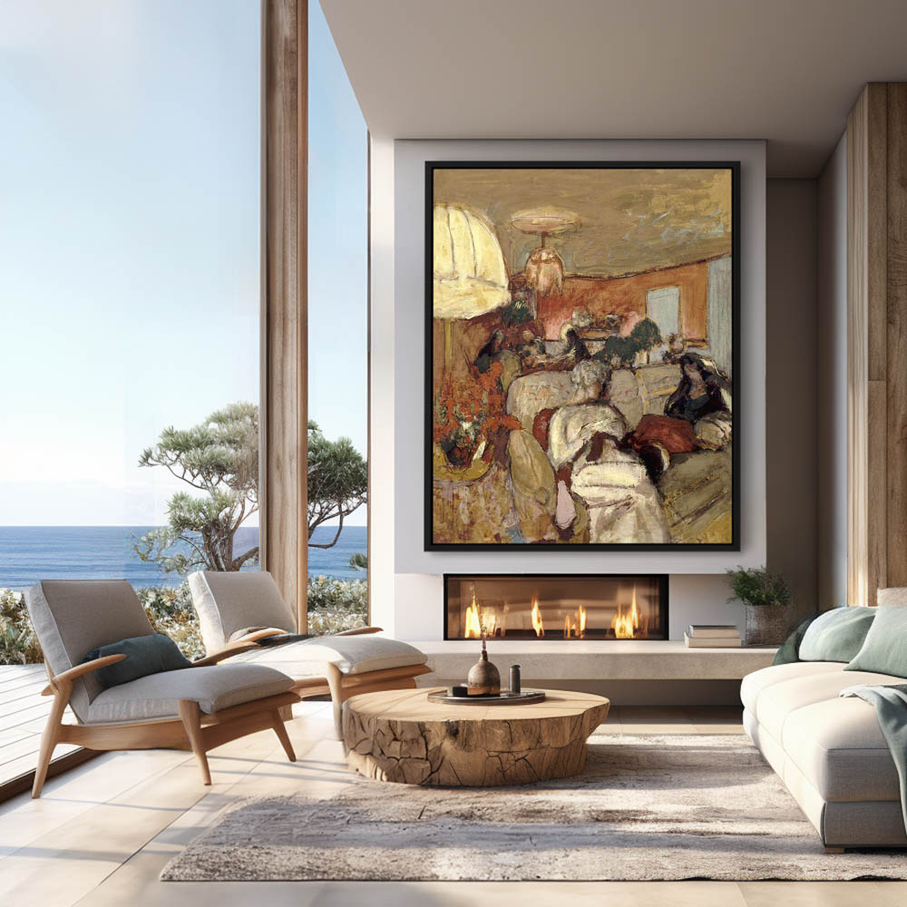 Abstract depiction of two women on a sofa and several figures gathered around the table behind them