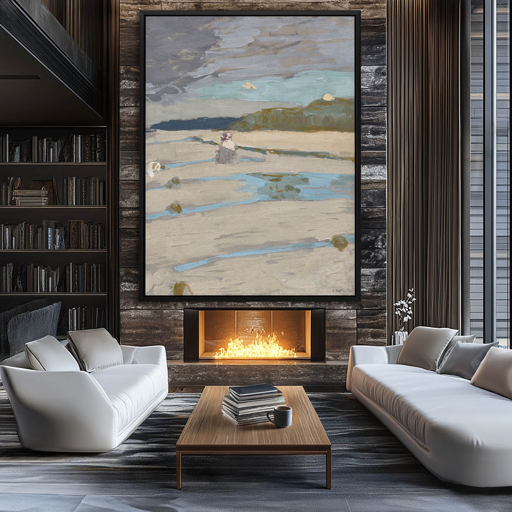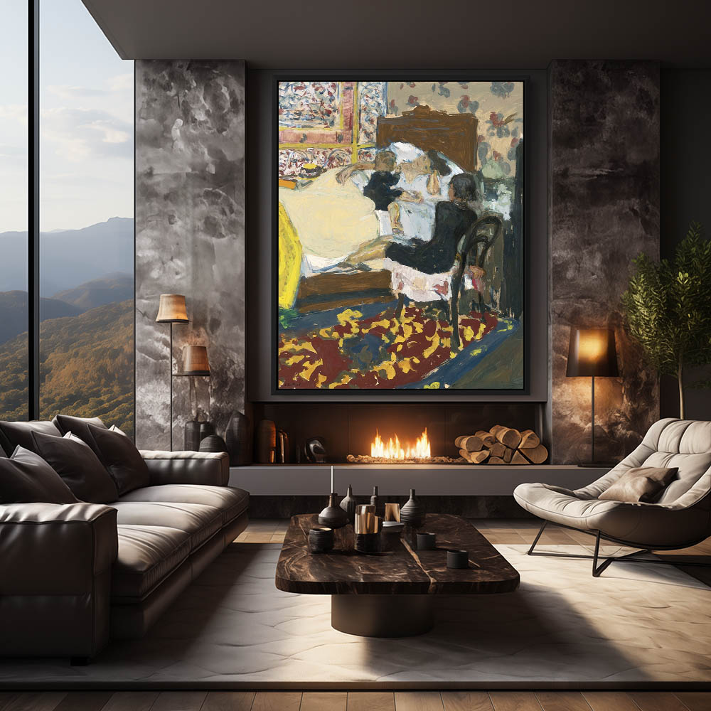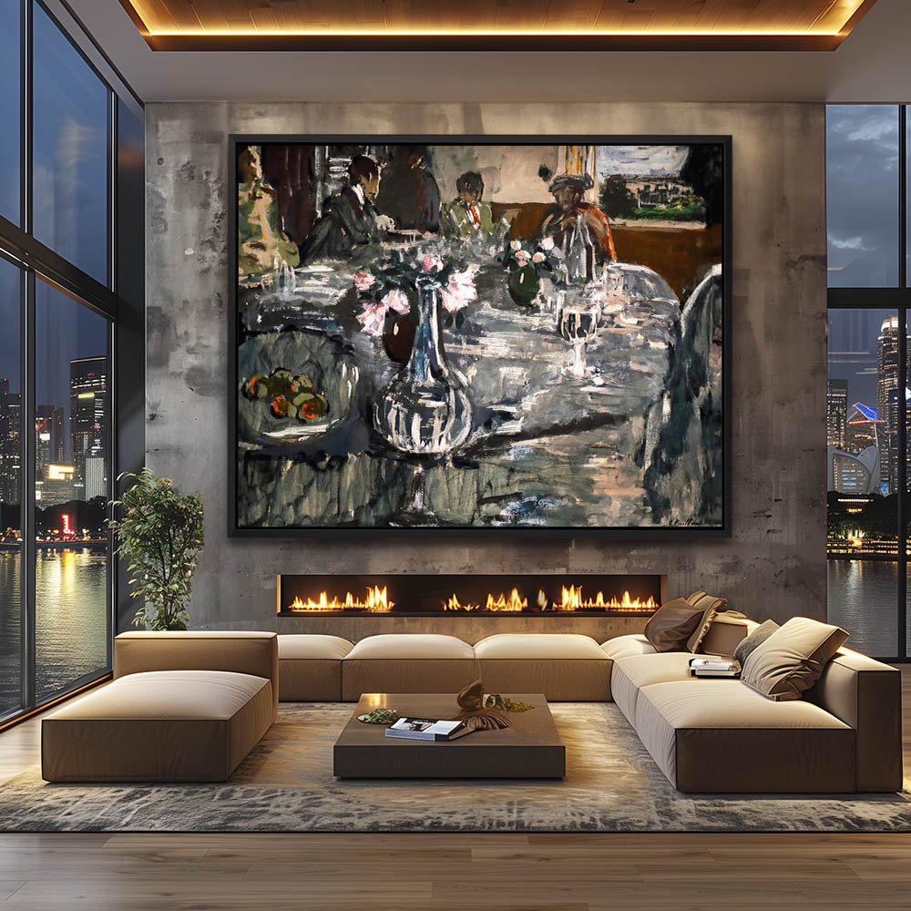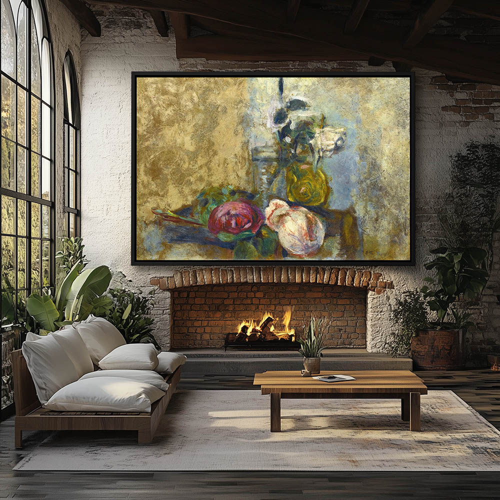 Abstract table setting with fruit, flower arrnagements and figures on the far side