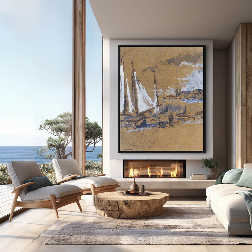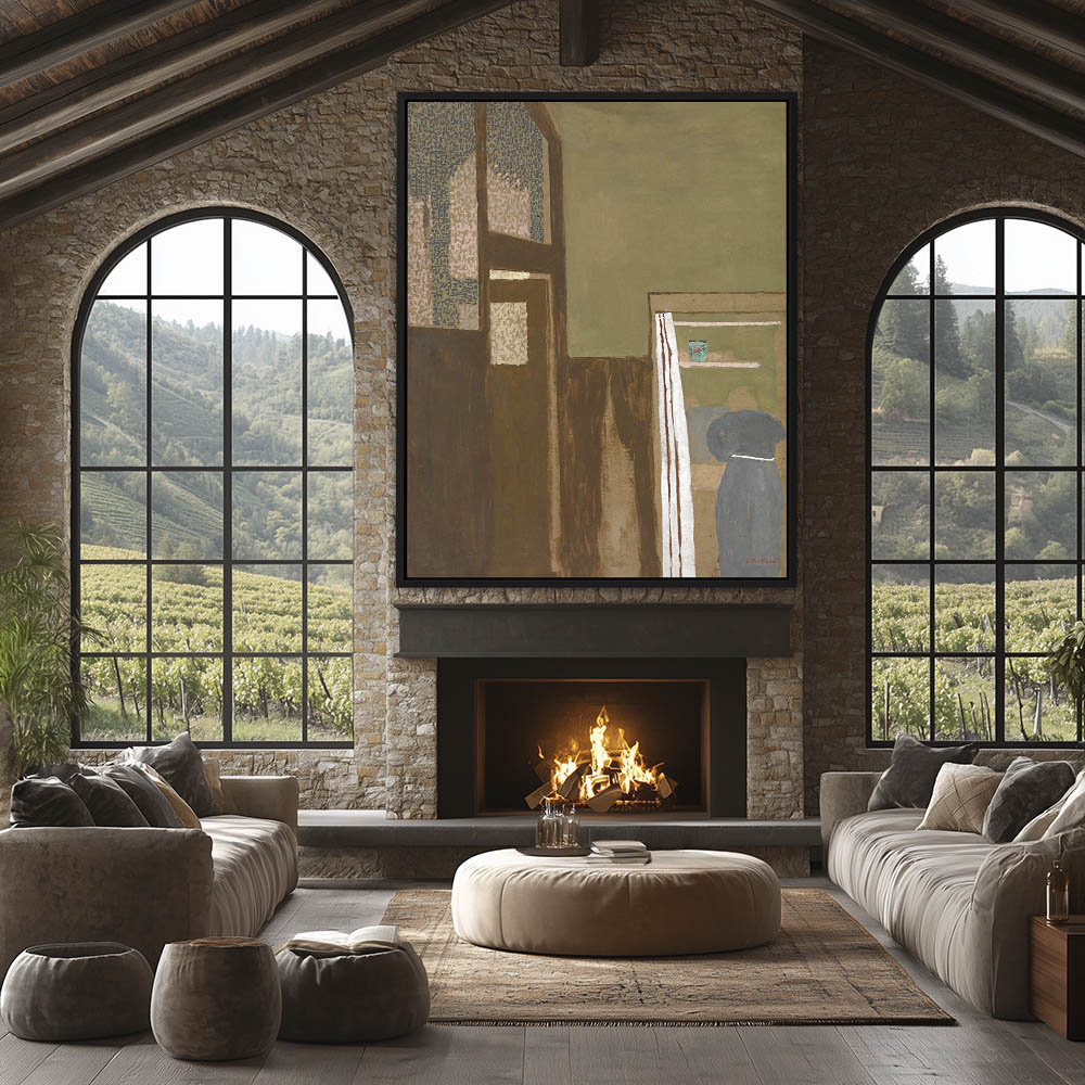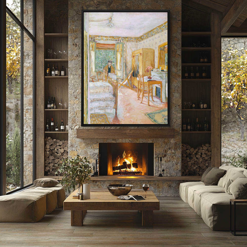 Interior scene with a woman in a sunlit bedroom with a large open window on the far side of the room