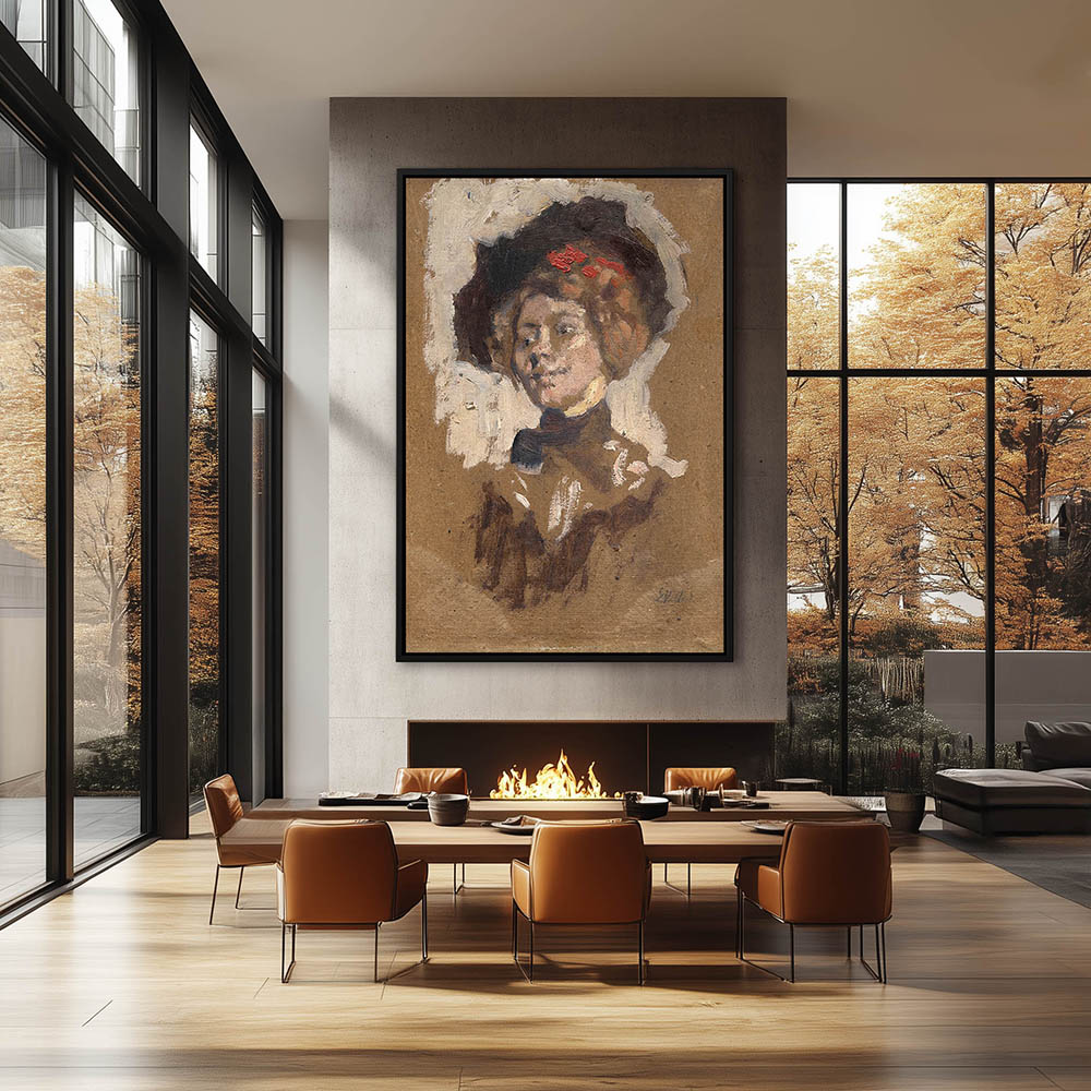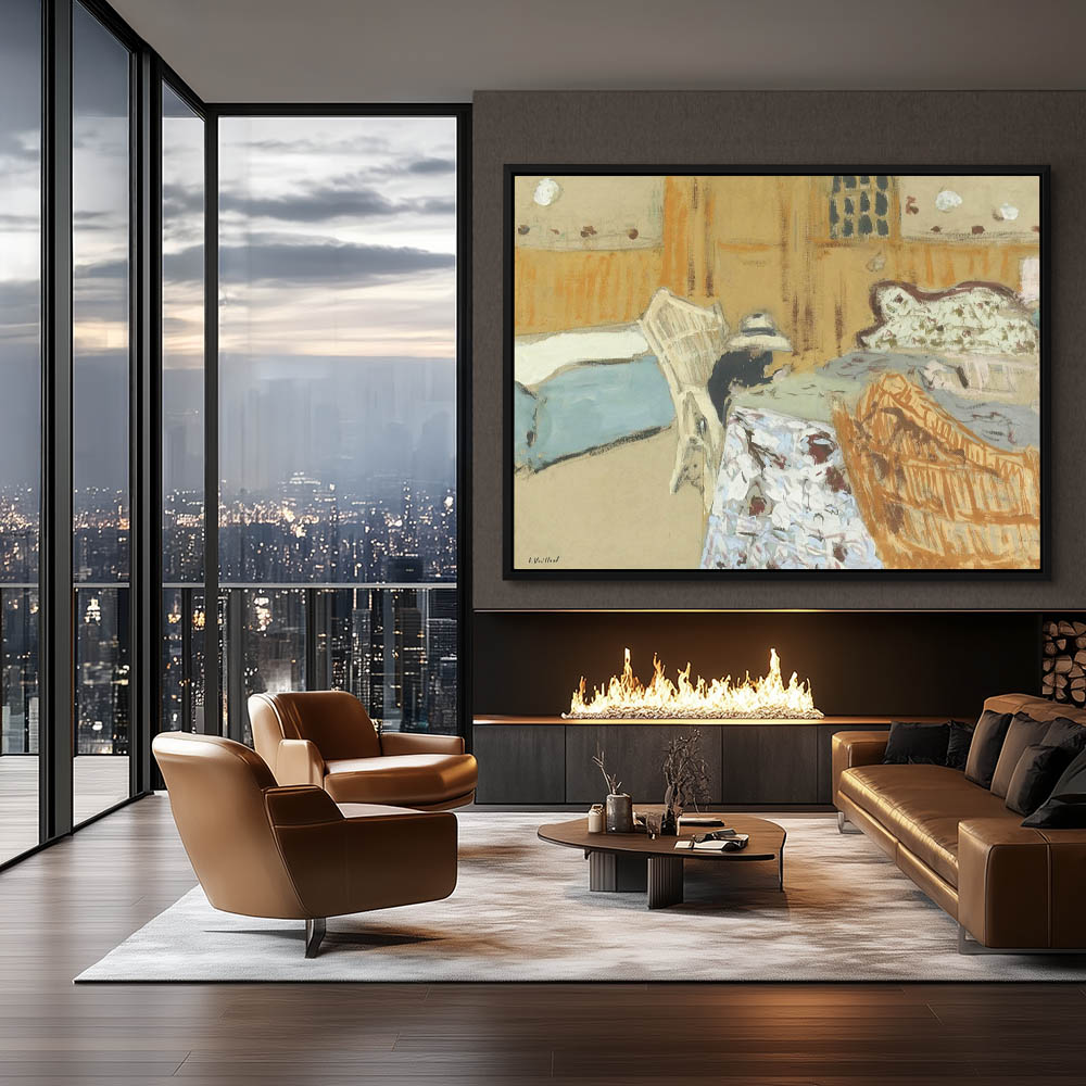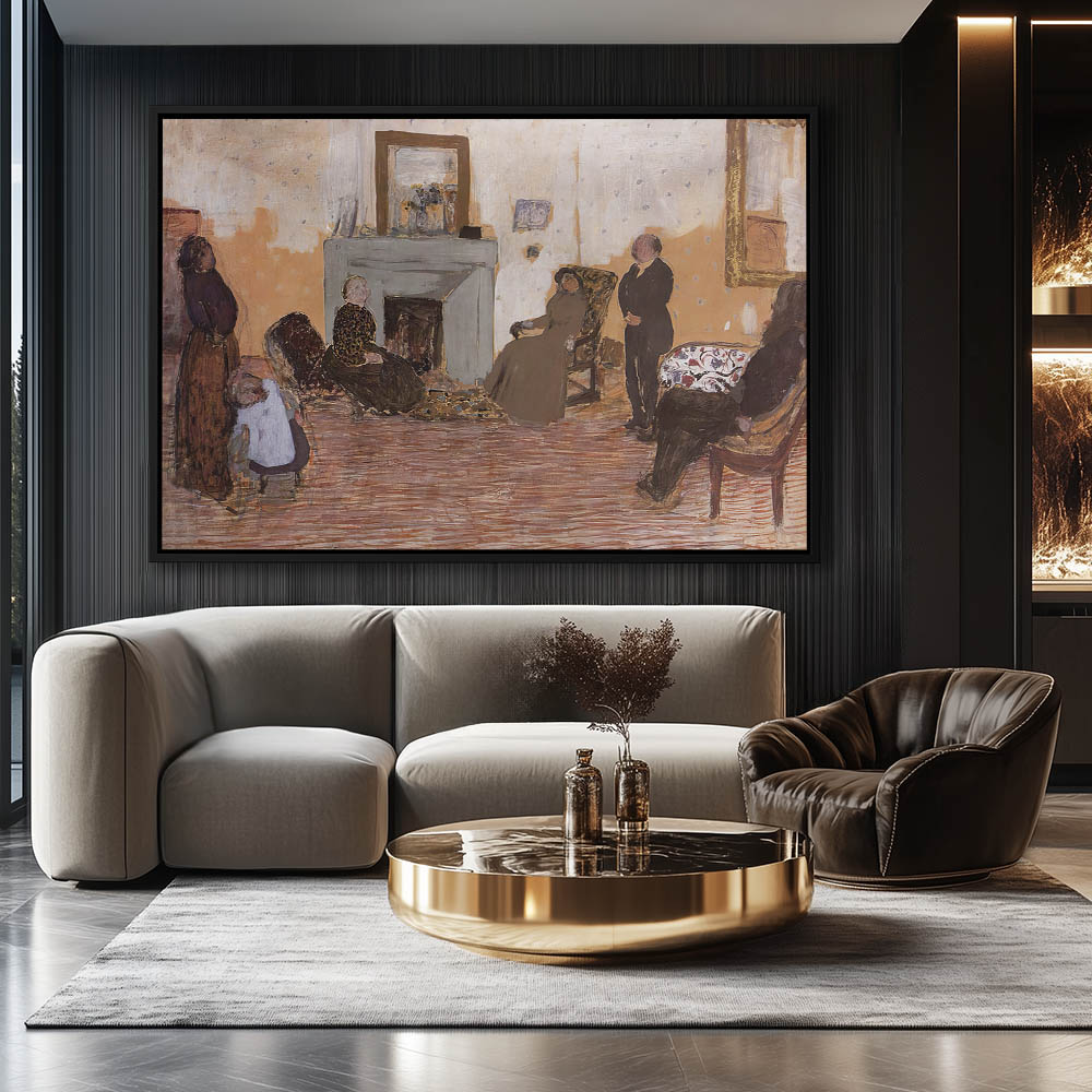 Woman in bed with two children beside and on the bed. Floral patterns adorn the carpets, wallpaper and wall hangings.