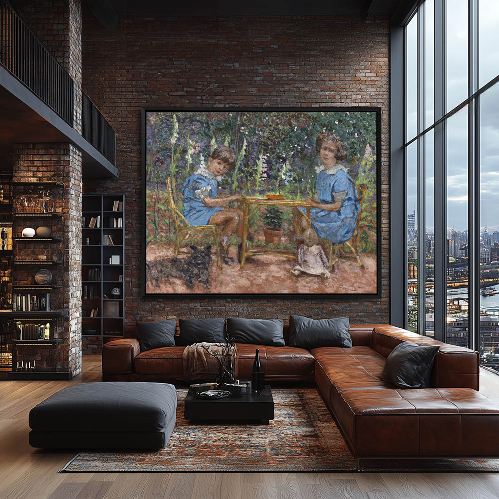 Two children in blue at a table in a flower garden with a dog and a doll beside them