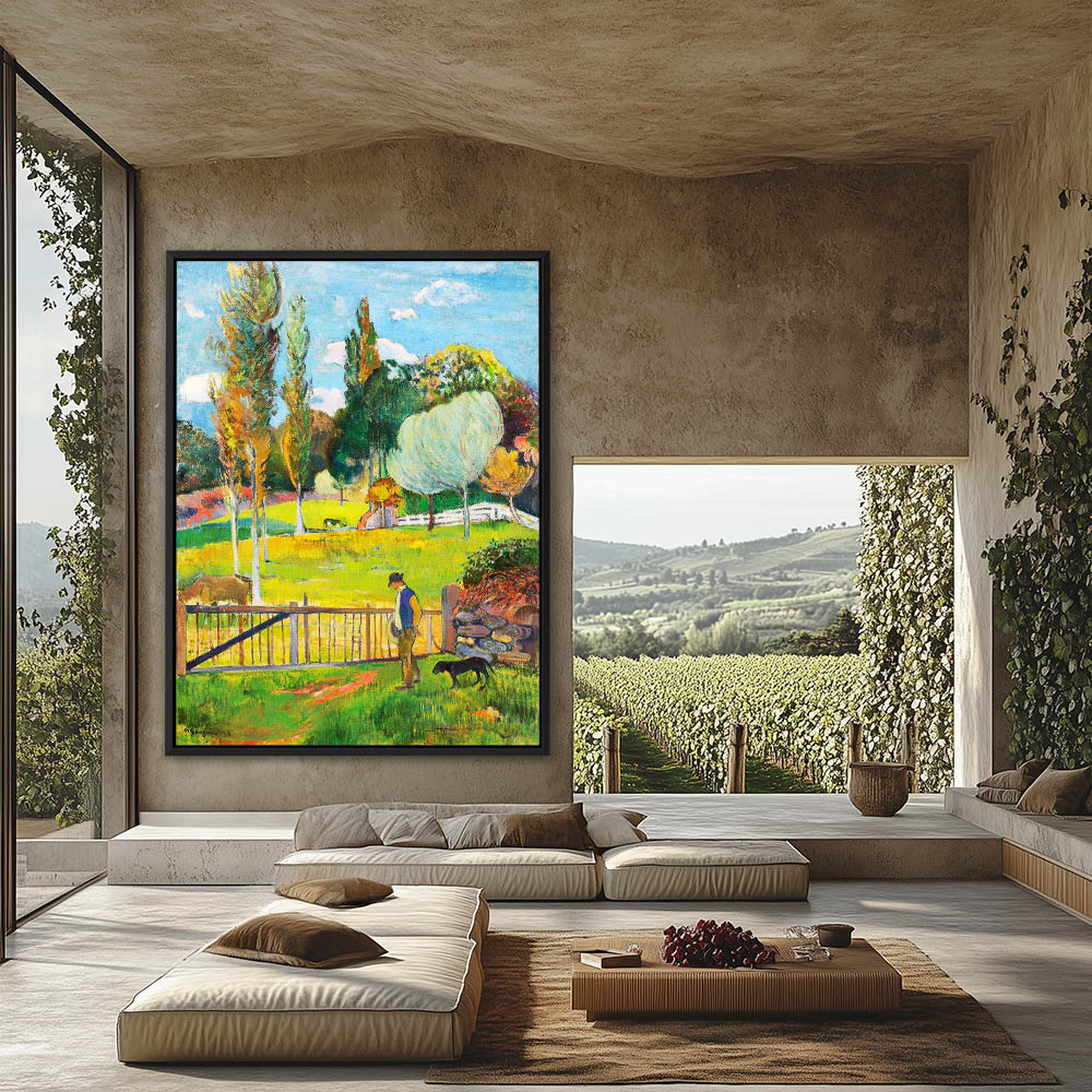 Vintage Abstract Farm Landscape Painting with a Farmer Walking his Dog next to the Fench with Cows