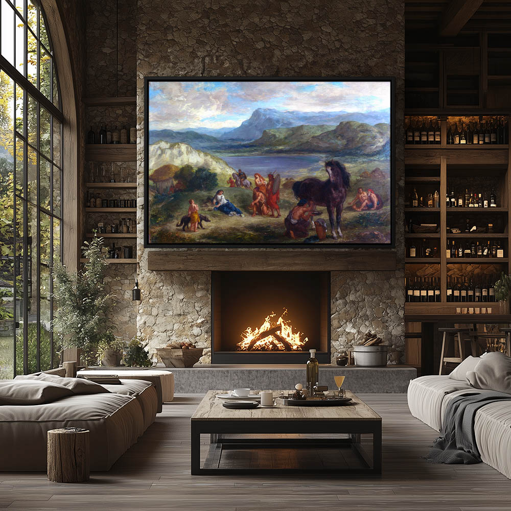 Vintage Figurative Landscape Painting with Figures Camping on the Lake Shore with a Horse and Dog