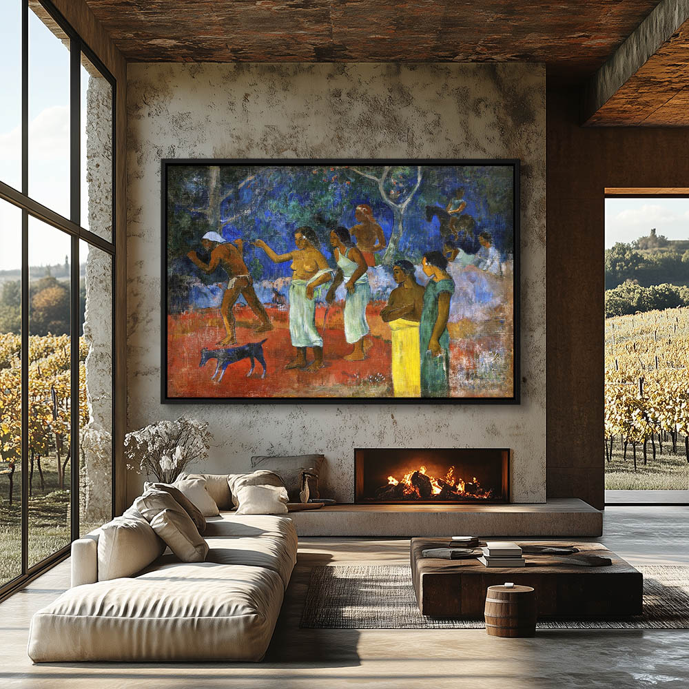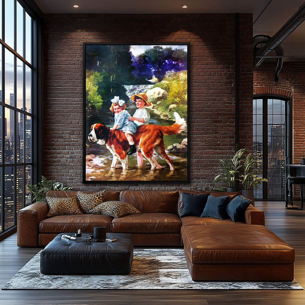 Vintage Figurative Painting with Natives a Dog and a Horse