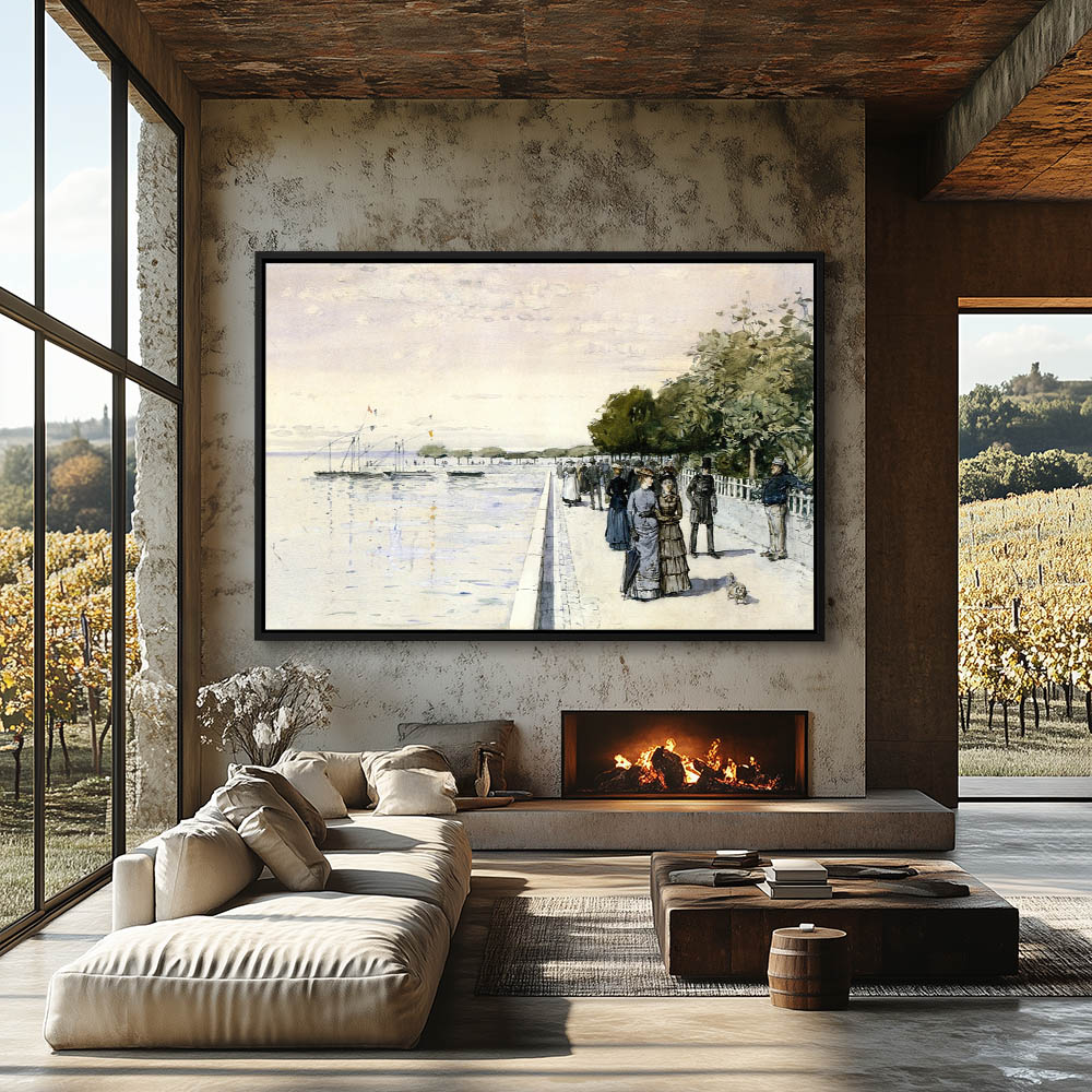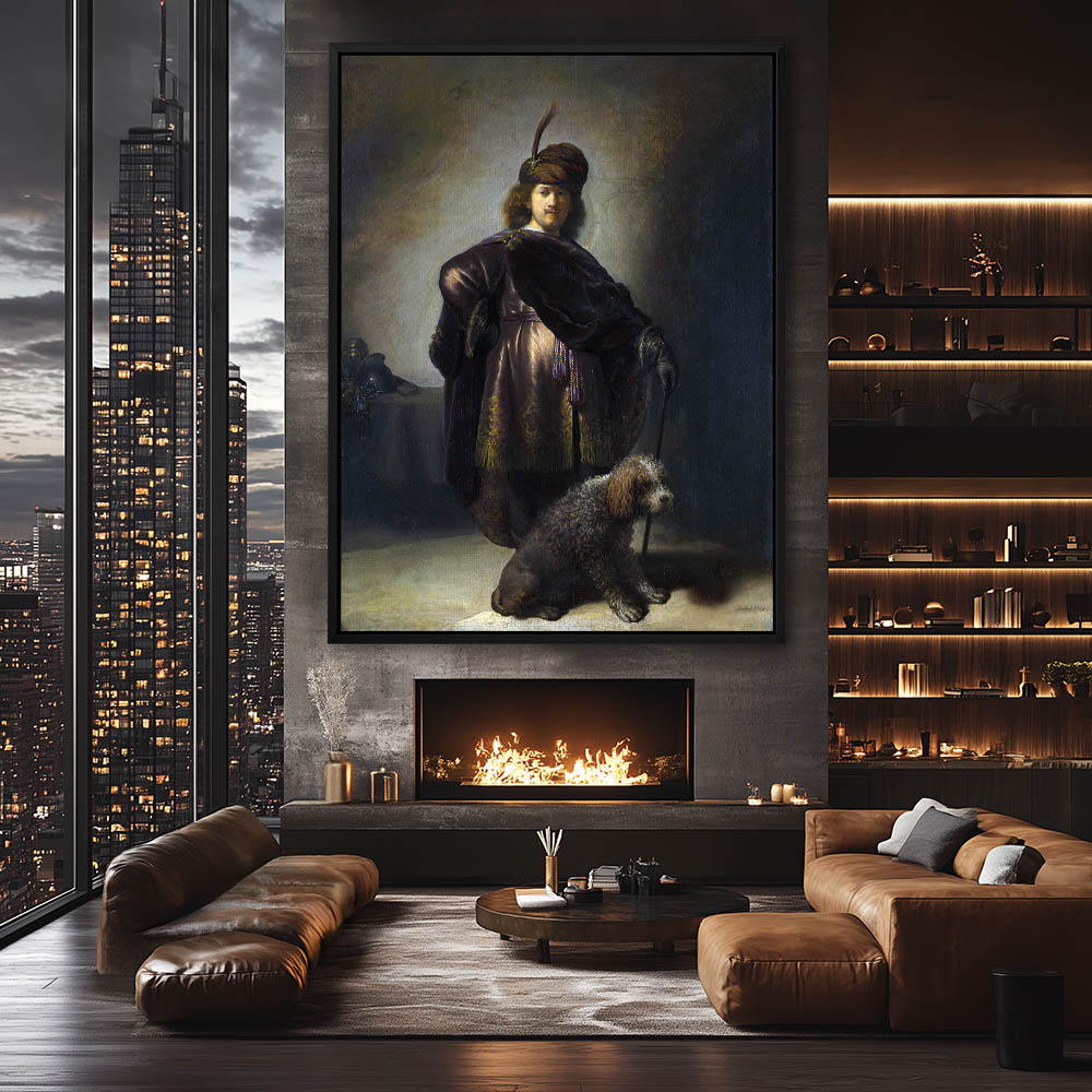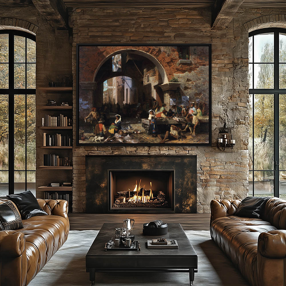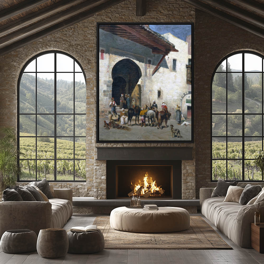 Landscape Painting of Figures with Horses and a Dog in Front of a Building